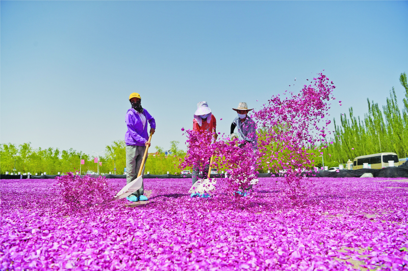 新疆于田瑰觅生物科技股份有限公司员工在晾晒玫瑰花。汤永/摄