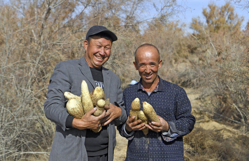 于田县被称为“中国大芸之乡”,大芸是当地特色经济作物之一。大芸又称“肉苁蓉”,作为寄生植物主要寄生在梭梭或红柳根部,每年春秋两季可采挖,素有“沙漠人参”的美誉,是传统名贵中药材。近年来,于田县将肉苁蓉产业规模化,鼓励当地村民利用风沙前沿的低产田种植红柳、梭梭等生态林,并在红柳、梭梭根部接种大芸,初步形成了“规模化、产业化、无公害化”的良性发展模式,为当地群众增收致富开辟了新路径。