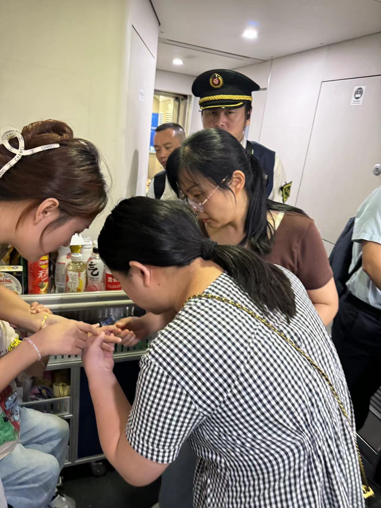 在 5号车厢,他们发现一个小男孩正捂着手喊疼。3名医生亮明身份后,立即查看伤情,并询问小孩受伤过程。