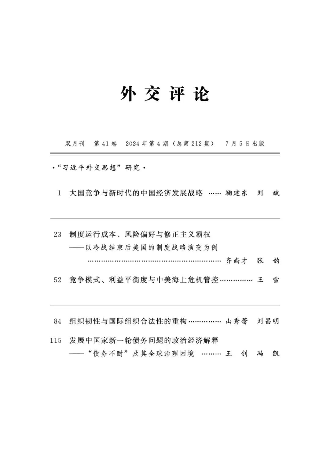 近日,国际政治领域领队期刊《外交评论》(2024年第4期)发表由清华大学五道口金融学院讲席教授、国际金融与经济研究中心(CIFER)主任鞠建东与对外经济贸易大学政府管理学院副院长、清华大学五道口金融学院国际金融与经济研究中心(CIFER)研究员刘斌共同撰写的文章《大国竞争与新时代的中国经济发展战略》。