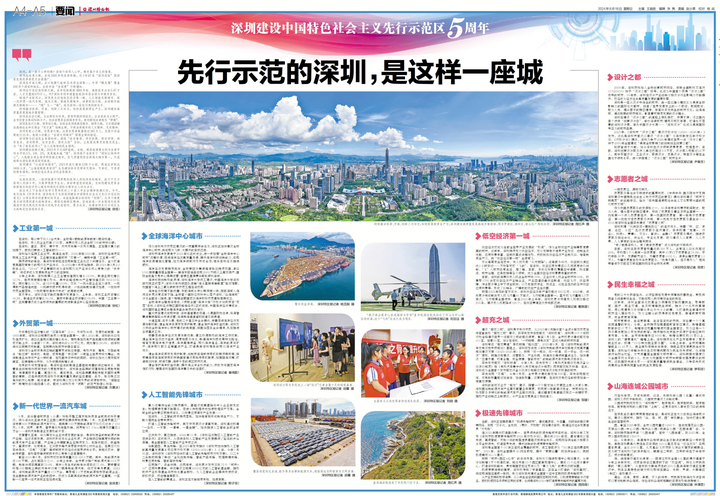 在全市上下全面兴起学习贯彻党的二十届三中全会精神热潮之际,今天,我们迎来《中共中央 国务院关于支持深圳建设中国特色社会主义先行示范区的意见》公布五周年的重要时间节点。深圳特区报选取部分深圳的“别称”,从多个维度展示深圳勇担重大战略使命,赓续弘扬特区精神,坚决在进一步全面深化改革推进中国式现代化的伟大实践中走在前列、勇当尖兵,向着深圳先行示范区五大战略定位奋进的足音。