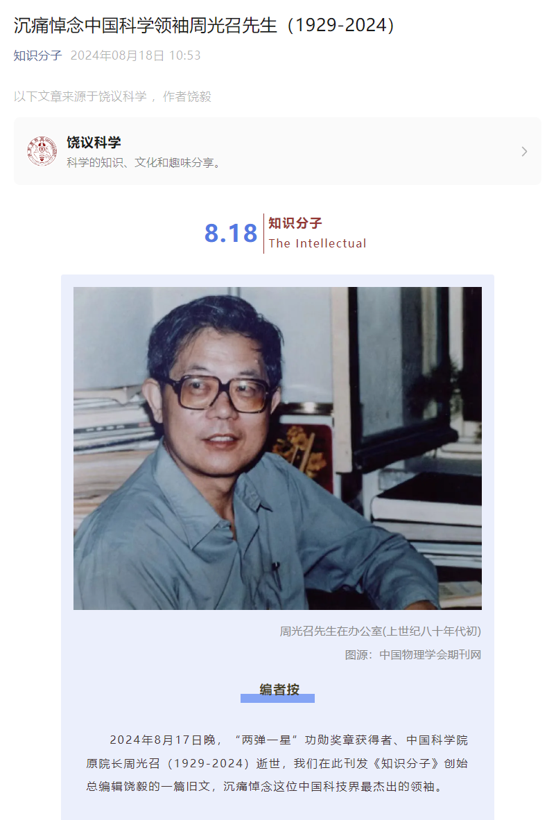 周光召逝世后,“知识分子”微信公众号推送《知识分子》创始总编辑饶毅的一篇旧文,沉痛悼念这位中国科技界最杰出的领袖。