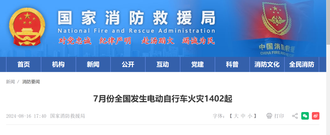 8月16日,国家消防救援局官网发布消息,日前,全国电动自行车安全隐患全链条整治工作专班公布了7月全国电动自行车火灾统计数据。数据显示,7月1日至7月31日,全国共发生电动自行车火灾1402起。