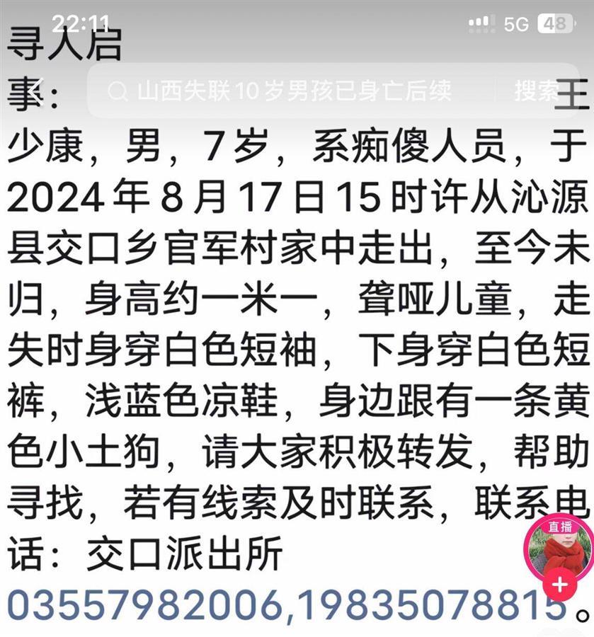寻人启事显示,走失孩子叫王少康,男,7岁,有智力障碍,还是聋哑儿童,于8月17日15时许从沁源县交口乡官军村家中走出,至今未归。孩子身高约1.1米,走失时身穿白色短袖,下身穿白色短裤,浅蓝色凉鞋,身边跟有一条黄色小土狗。