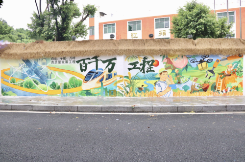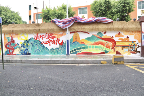 以青翠山峦为画布之魂,使“青山绿水”的理念跃然于画布之上,爱国爱党主题的墙绘作品静静地诉说着党的光辉历程。