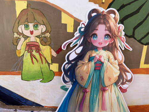 同时让小朋友在墙绘上进行人物绘画创作,手绘完成过后再把小朋友的画通过AI呈现出来并以立牌的形式摆放到旁边。