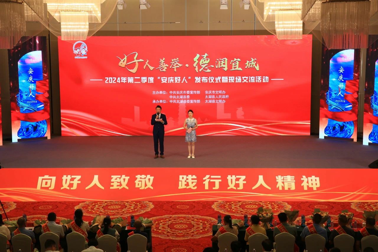 8月14日,安徽省太湖县举行“好人善举·德润宜城”2024年第二季度“安庆好人”发布仪式暨现场交流活动,部分“中国好人”“安徽好人”代表参加活动。
