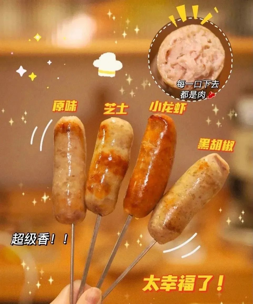5款我们强烈推荐的口味:秘制孜然脆骨肠、黑胡椒味烤肠、原味、芝士、小龙虾烤肠。