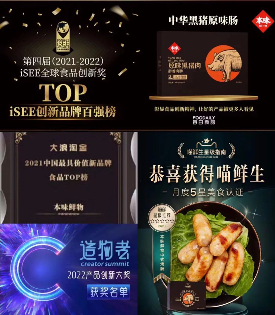 “第四届iSEE全球食品创新奖”、2022造物者产品创新大奖、2021中国最具价值新品牌、喵鲜生星级指南月度5星美食认证等。
