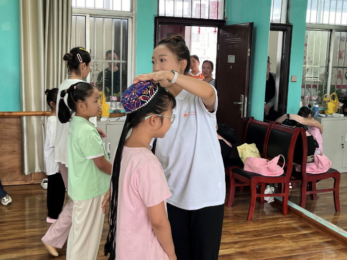 为了传承和弘扬民族文化,增强青少年儿童民族自豪感和文化认同感。服务团的志愿者们根据自身专业优势分别为孩子们安排了敦煌舞、新疆舞和傣族舞三种民族舞蹈的教学活动。在整个教学活动中,学生们不仅欣赏到了各种风格的舞蹈表演,还亲手尝试了学习舞蹈动作。在团队成员的耐心指导下,学生们逐渐掌握了舞蹈的要领和技巧,感受到了传统民族舞蹈的独特魅力。