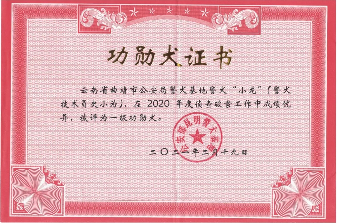 “小龙”是史小为一手带大的功勋犬,曾是西南片区最年轻的“一级功勋犬”,才有一岁半,主要负责硬质地面、山地追踪和物证搜索,可谓年少成名,先后参与了多起重大刑事案件的侦破工作,应邀参加湖南卫视《天天向上》“上岗吧!工作犬!”节目录制,并向全国观众科普刑侦综合犬的培养训练及日常工作,展示云南警犬风采。