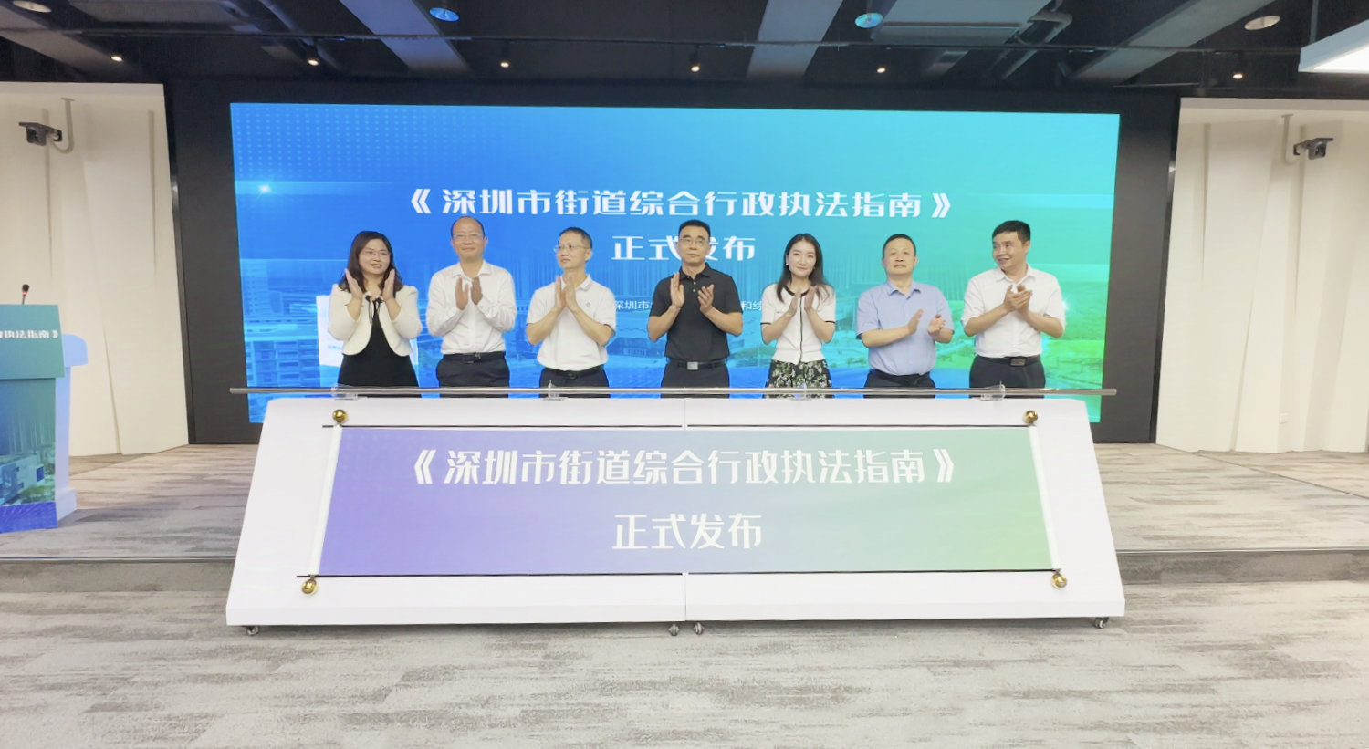 当天下午,《执法指南》发布会正式开始,随着领导、嘉宾共同推动拉杆,印有“深圳市街道综合行政执法指南”的卷轴缓缓展开,全市首部受知识产权保护的街道综合行政执法指南正式发布。