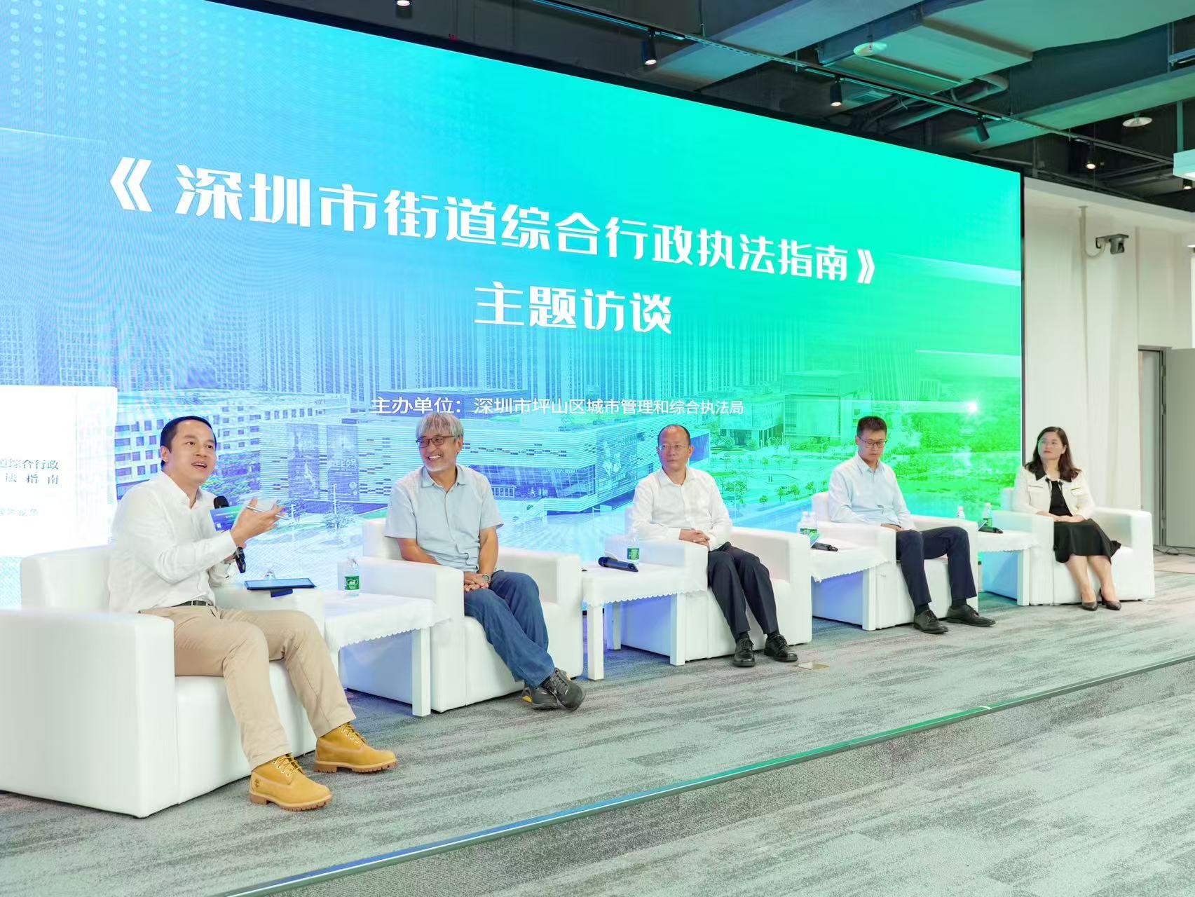 随后,《执法指南》主题访谈会举行,深圳自然与历史研究者、深圳市城市规划委员会委员南兆旭,华南理工大学法学院教授、广东省法学会重点法治基地“法治评价与研究中心”执行副主任滕宏庆担任访谈嘉宾,与坪山区城市管理和综合执法局相关负责人、《执法指南》主编,共同围绕书籍的编纂背景、内容及实践意义进行深入探讨。