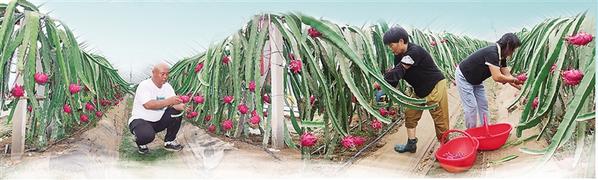 放眼望去,一座座温室大棚整齐排列,一旁的小道上方挂满了葡萄藤蔓,行走在藤蔓之下,微风拂来,让人顿觉清爽。走进大棚,只见一簇簇火龙果藤枝排列有序,一颗颗红色的火龙果挂在绿色的藤枝之上,一派喜人景象。工作人员提着篮子,穿梭在火龙果藤枝之间采摘成熟的果子,忙得不亦乐乎。“目前,我们的火龙果已经成熟,前来采摘的群众络绎不绝。此外,我们还通过电商平台,把火龙果销售到了上海、天津、山东等地。”崔高领介绍,“目前,我们一共种植了40座大棚的火龙果,一座大棚占地2亩左右,从7月份开始采摘,到第二年的1月份采摘结束,可以连续采摘多茬。一座大棚,一年产量有四五千斤,经济效益很好。”