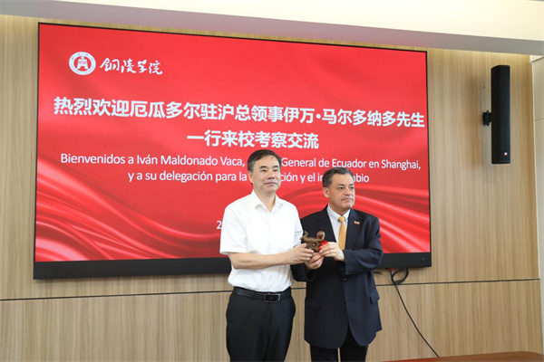 伊万·马尔多纳多对铜陵学院的热情接待表示衷心感谢。他表示,厄瓜多尔与中国长期以来保持着密切的交流与合作关系。此次来访,对铜陵经济文化发展和铜陵学院国际化建设成果留下深刻印象。他认为,该校招收厄瓜多尔学生来华留学,既为中厄青年人才搭建交流共进的桥梁,也为厄瓜多尔青年学子提供更多发展机会,将全力支持铜陵学院厄瓜多尔留学生项目。未来希望与铜陵学院开展深层次、多形式的文化交流,服务两国发展繁荣,实现互利共赢。