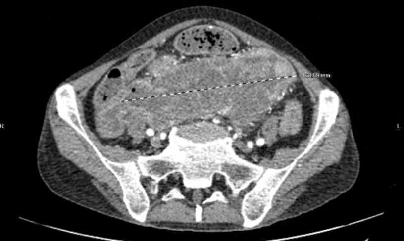 在仔细检查评估后,尹晖明主任发现,胡先生体内肿瘤十分巨大,累及盆腔内大部分脏器,乙状结肠、部分回肠、回盲部、升结肠、膀胱、右侧盆壁等部位,毗邻腹盆腔重要脏器及重大血管主干及分支,合并肠梗阻、中度贫血、低蛋白血症、严重营养不良等多种并发症,手术难度和危险程度相当高。