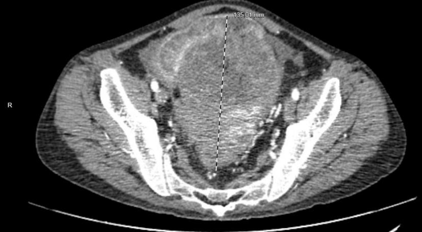 为确保将手术风险降到最低,经过多学科评估以及周密的围术期管理方案,在患者贫血及低蛋白血症等得到有效纠正的前提下,8月23日,医院普通外科主任尹晖明带领团队医生副主任医师谢承志、主治医师唐曙光、住院医师邓浩进行了“乙状结肠恶性肿瘤根治术+腹腔镜下全盆腔脏器切除手术”,术中见盆腔肿瘤大小约20*16*15cm,如术前所预计的一样,乙状结肠肿瘤累及部分回肠、回盲部、膀胱、右侧盆壁,术中行乙状结肠癌根治+全盆腔淋巴结清扫+部分回肠升结肠切除+膀胱全切。将降结肠与直肠残端吻合,保住患者的排便功能,明显提升了患者术后的生活质量。