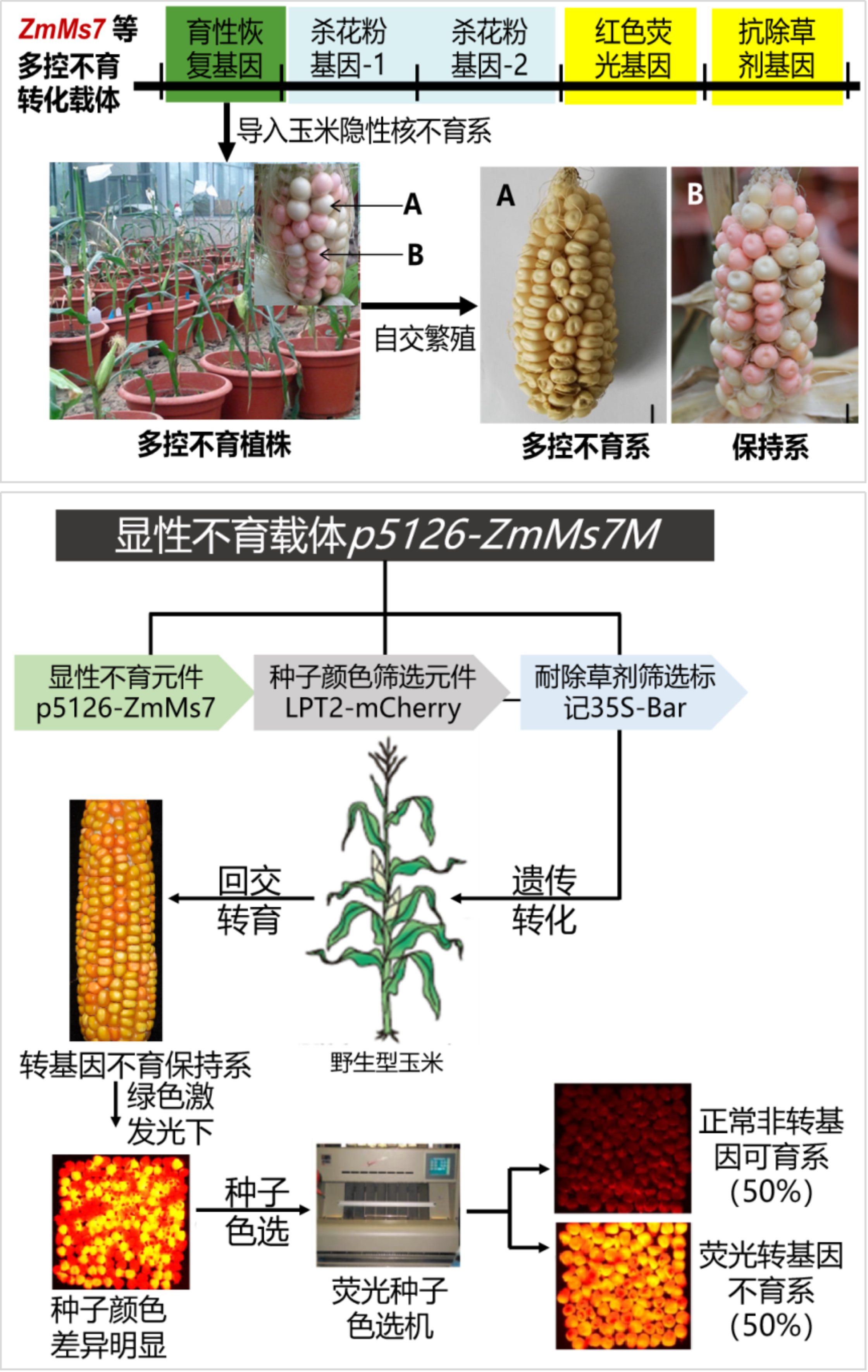 2023年,我国玉米杂交制种面积高达462万亩,主要依靠人工去雄,存在着制种成本高、制种纯度和产量偏低等突出问题。基于细胞质雄性不育的“三系法”制种技术,由于胞质不育系育性不稳定、单一胞质易受专化病原小种感染等问题,在玉米杂交制种中应用十分有限。近年来,玉米新型工程核不育制种技术发展势头良好,由于其育性遗传稳定、不受光温等环境条件影响,具有巨大的产业化应用潜力。玉米多控不育杂交制种技术2024年已经在新疆伊犁实现160亩的小面积示范应用,缓解当地劳动力短缺问题、降低制种成本,应用前景广阔。