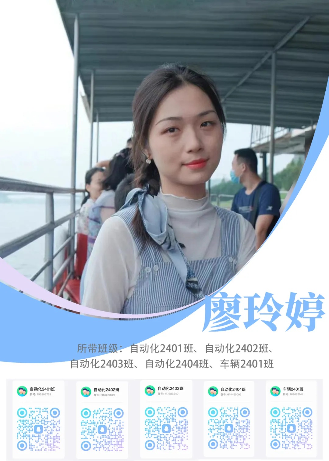 个人简介:中共党员,硕士毕业于湖南大学建筑学专业,现任汽车工程学院辅导员。任职内从事学生工作,主要负责团委、学生组织工作。