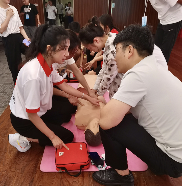 培训现场,黄丹、伍静薇分别为大家讲授了心肺复苏(CPR)、自动体外除颤(AED)和气道异物梗阻(海姆立克急救法)等急救知识,并结合真实事例,以播放幻灯片和视频、现场演示等形式,向参训人员强调应急救护“黄金四分钟”的重要性,并通过互动问答,加强参训人员对急救知识的理解和掌握,现场气氛活跃。理论课后,讲师借助模拟人对应急救护技能操作要领进行细致全面的现场示范,一对一指导参训人员进行CPR和AED操作练习,力求每一个动作标准、到位。
