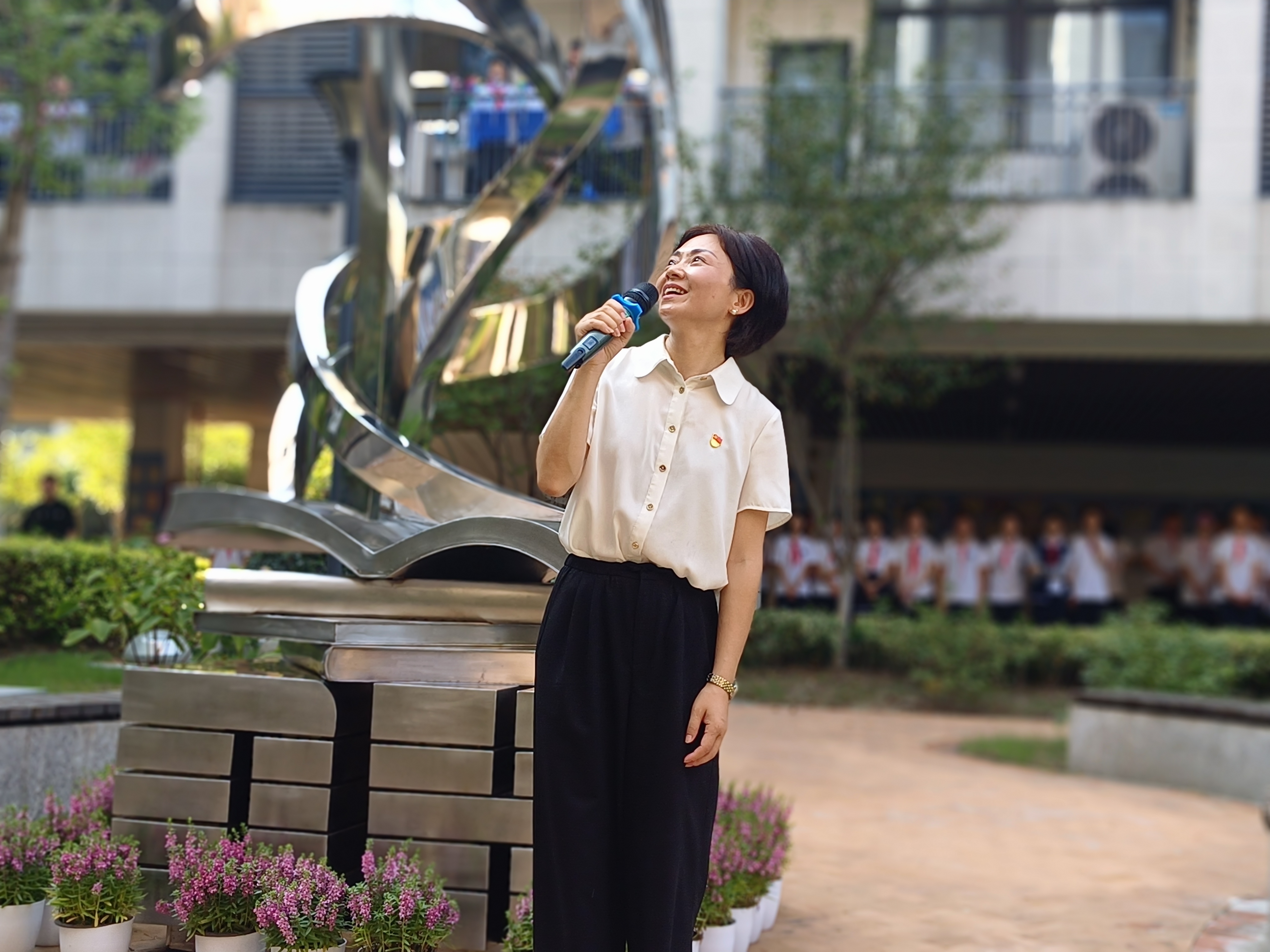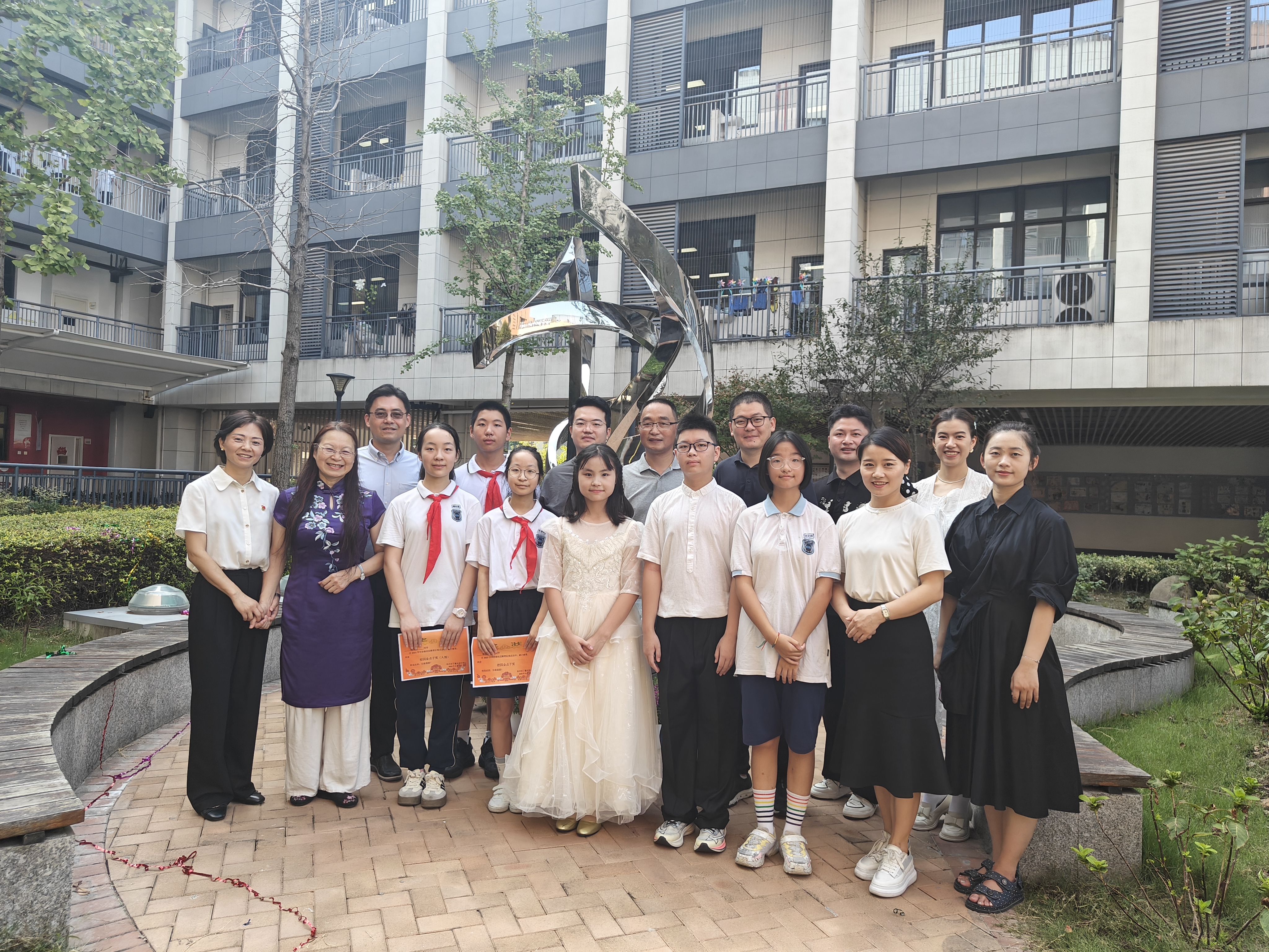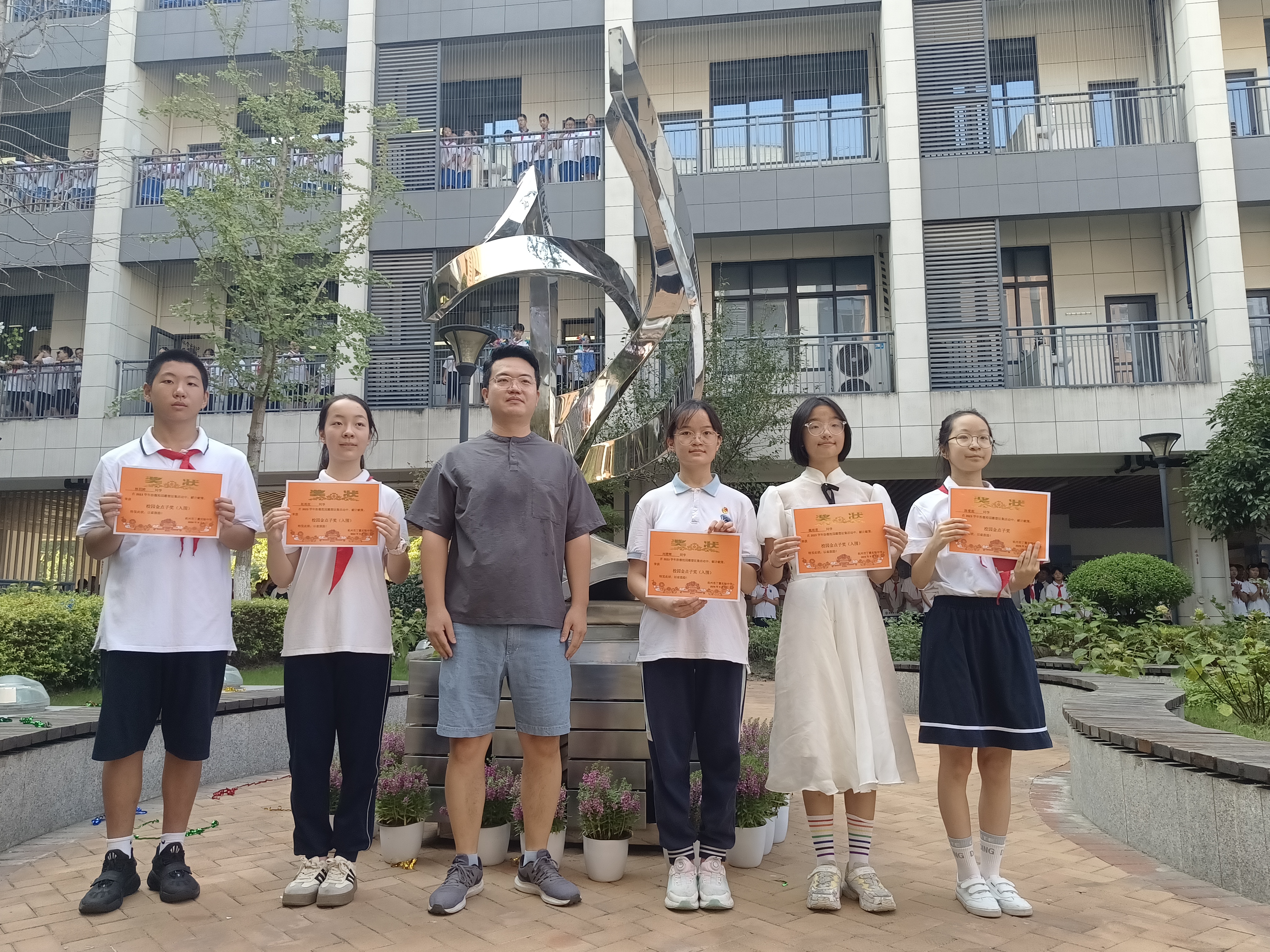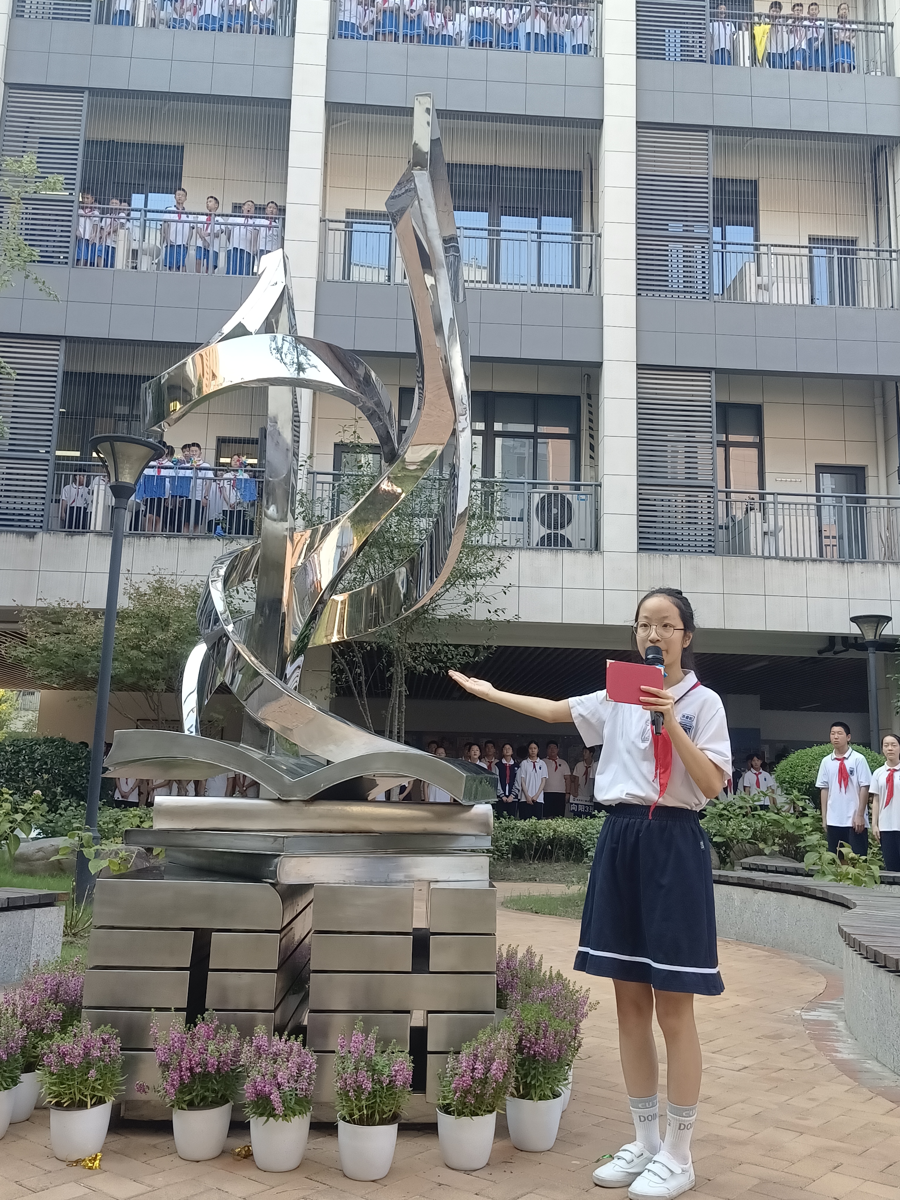 杭州市丁蕙实验中学校长王丽丽跟同学们讲述了“蕙·聚”这一雕塑成型的历史,从项目征集到操作实施,从作品评选到可行性论证…… 每一步都镌刻着蕙中人的勤劳与智慧,也是校家社政协同共育的美好体现。雕塑是“扮靓校园”的开始,期待学生们后续有更多更具智慧的创意涌现。