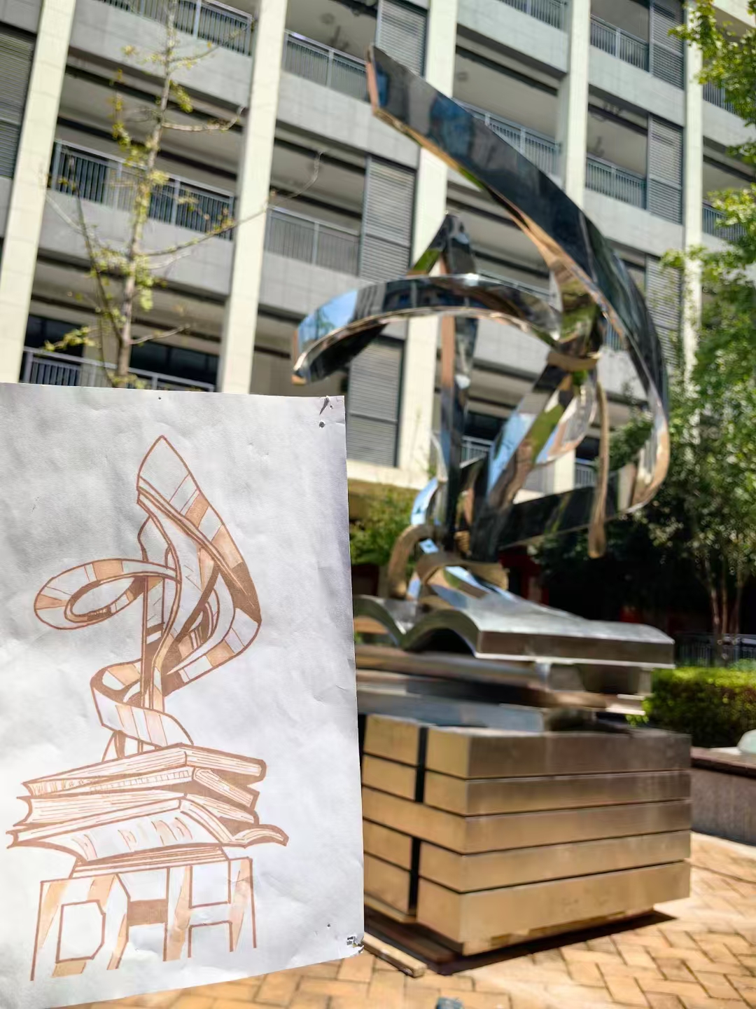 这件完全由学生们主导设计并参与完成的艺术品也正式与全体师生见面。雕塑取名“蕙·聚”,坐落在校园最核心的位置。雕塑完全由学生主导设计,融入了DH、书籍、兰花枝叶、飘带等艺术元素,整体呈螺旋上升的造型,象征着昂扬向上、蓬勃进取的生命力,也寓意学校群英荟萃,人人都是校园的扮靓人和建设者。
