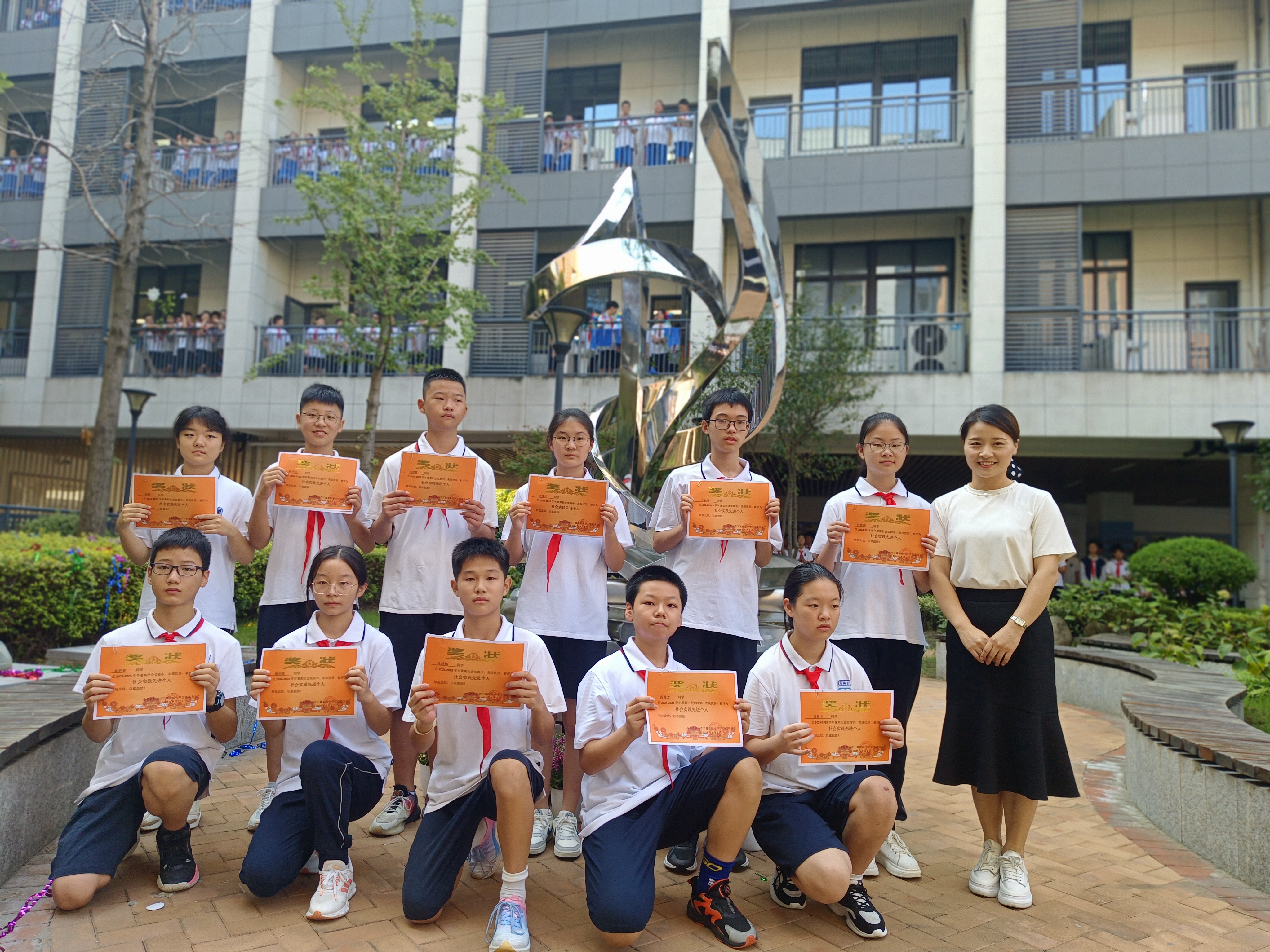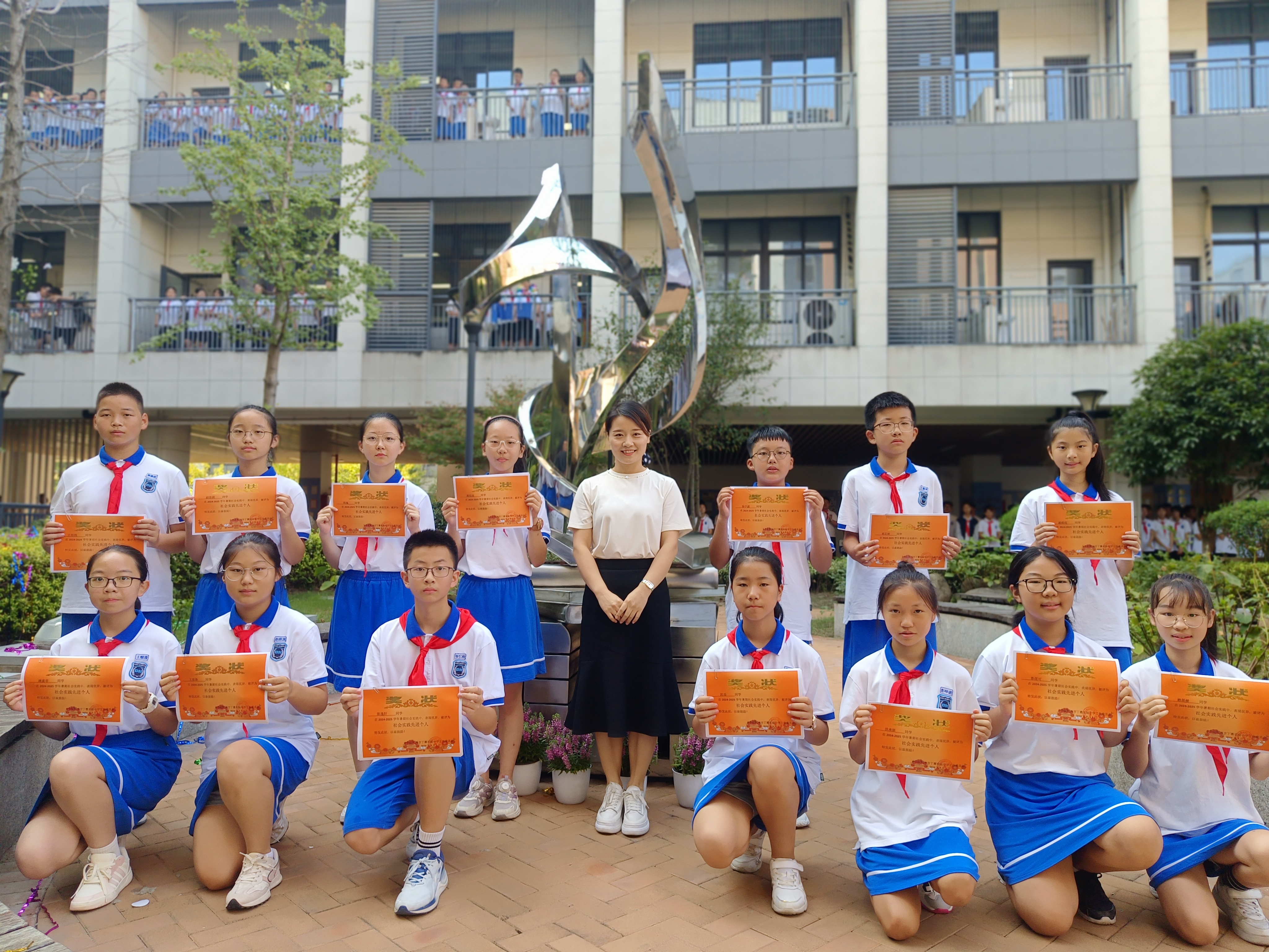中国美术学院建筑学院吴昊文老师,为校园雕塑设计团队颁发校园建设金点子奖。吴老师也给学生们送上新学期美好的祝福,期待学生们新学期“蕙”聚力量,乘风破浪。校家委副主任蔡菲女士为学生们颁发了“社会实践先进个人”,表彰他们在暑期社会实践中开展的志愿服务。蔡女士认为这真是一次难忘的经历,很荣幸见证了学校的历史,也感恩每一次美好的遇见。