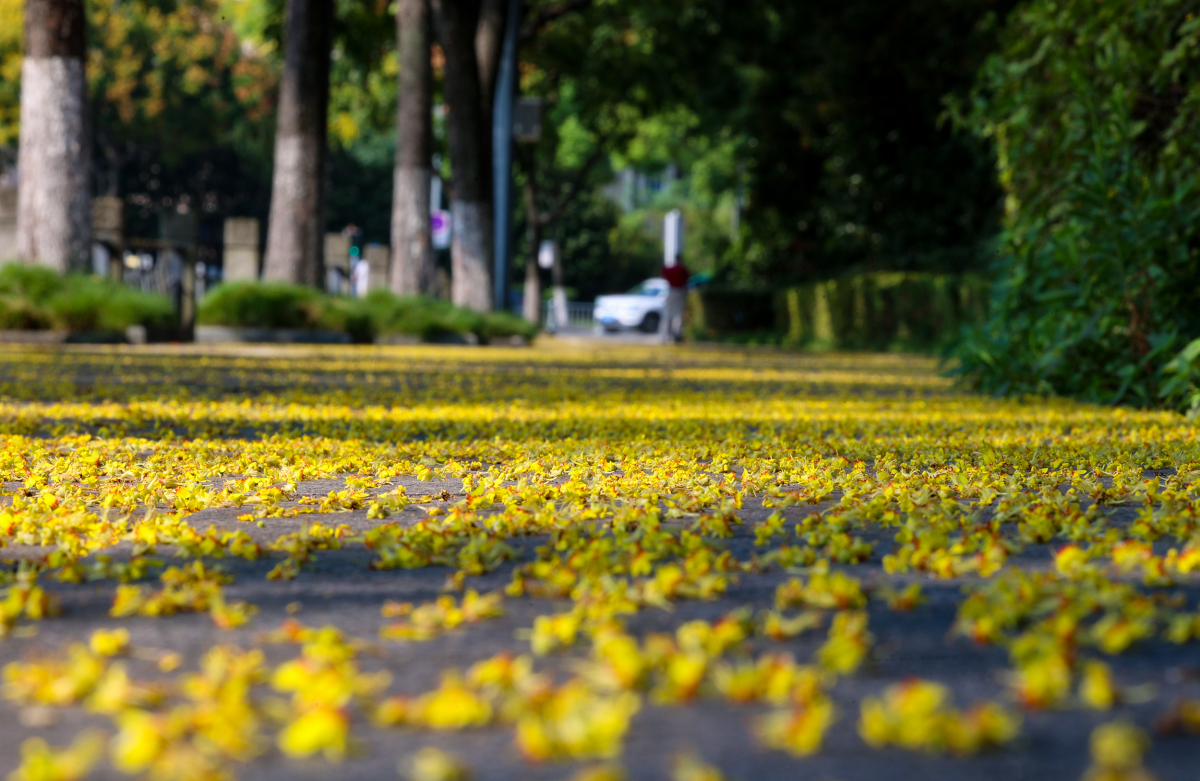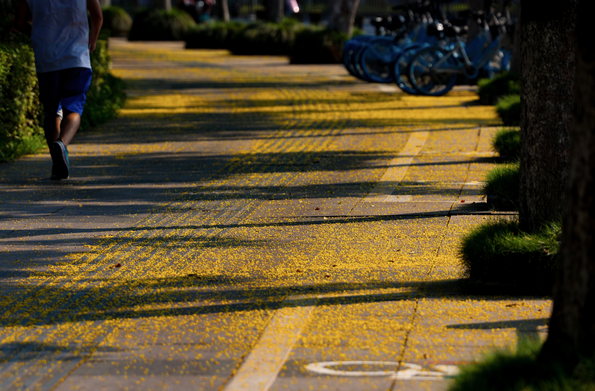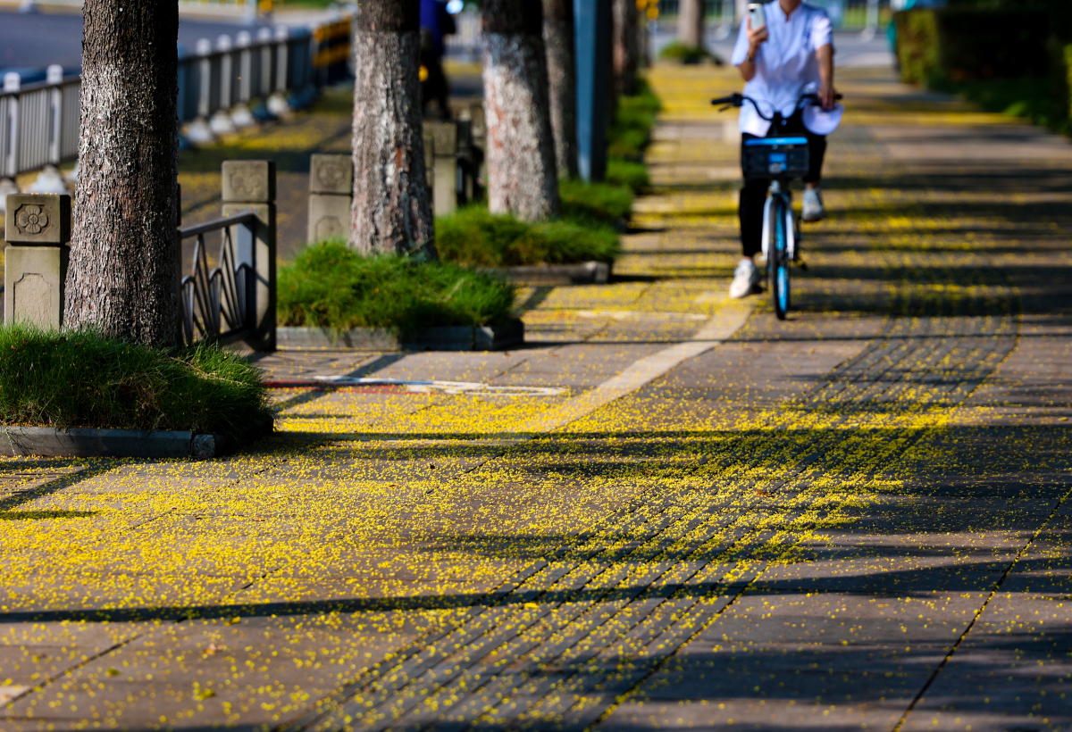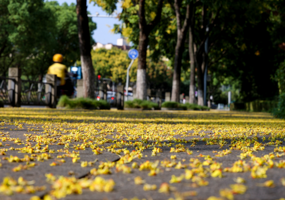 在江北区湖西路,金黄色的小花朵围拢成圆锥花序,宛若一丛丛黄金塔簇拥在树梢。风吹过,颗颗落下,在马路上也“开”出一片花海。从路边拾起一朵,四枚黄色花瓣张扬着,基部透出一点胭脂红,宛若振翅的小蝴蝶,惹人喜爱。