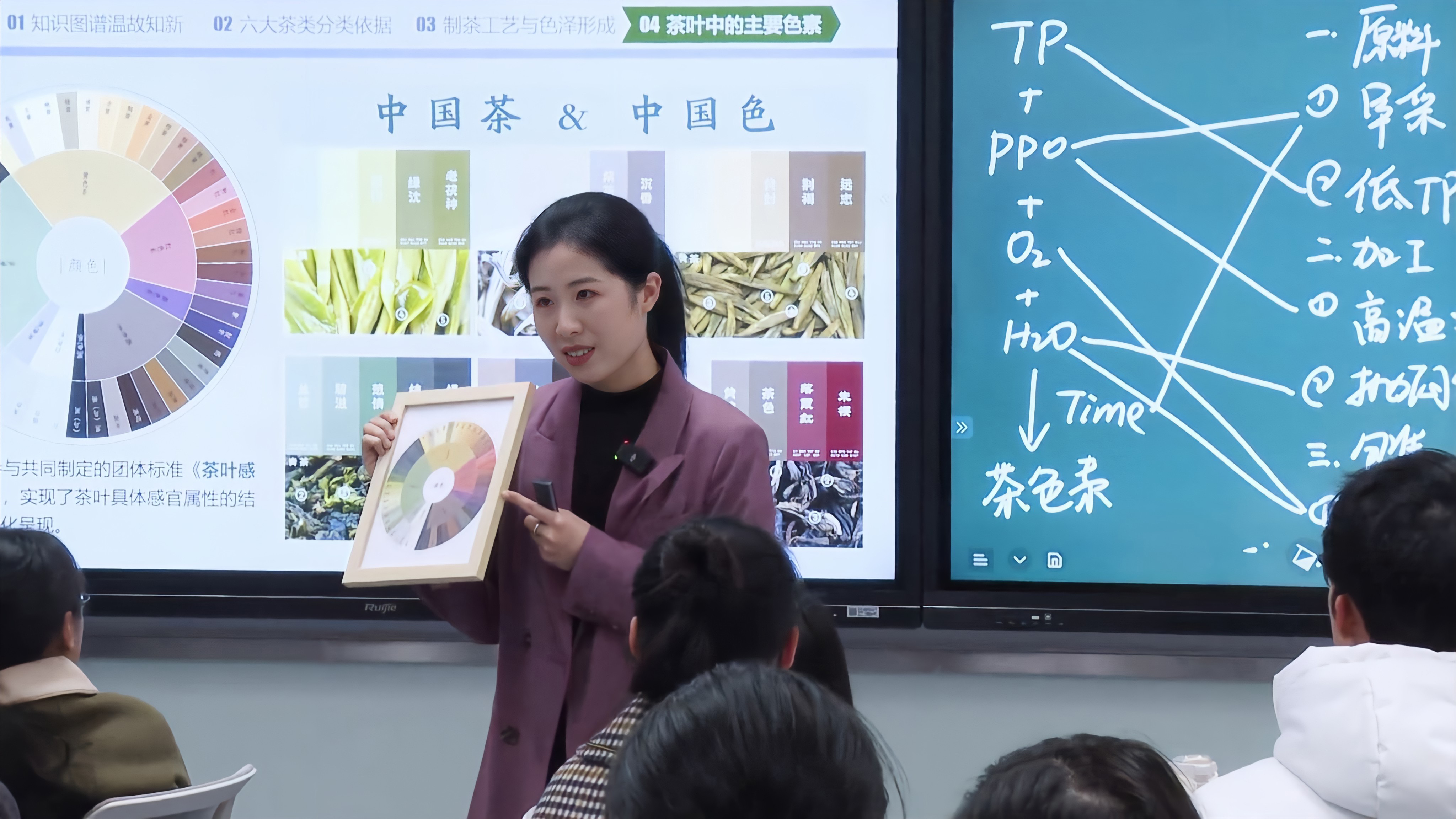 通过学校举办的一场场专题培训,周继红不断汲取养分并开展教学创新。她积极将现代的信息技术融入教学,设计了课程知识图谱,并与拓展资源链接二维码一同融入教材,同学们手机扫一扫就可以查看每个知识点的思维导图、视频资源和PPT课件。同学们说,周老师的课充满科技感:“AI教学助手大明白”可以进行智能问答,并能通过智能搜索匹配丰富的教学资源和习题库,让一百多人的大班教学也能拥有一对一的AI助教;考前检验复习成果时,可以通过“茶知识100问”小程序进行查漏补缺……