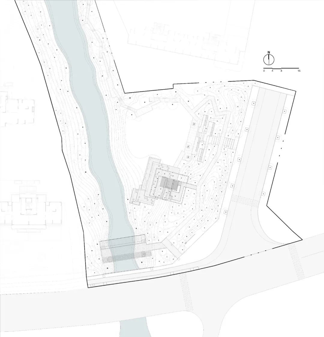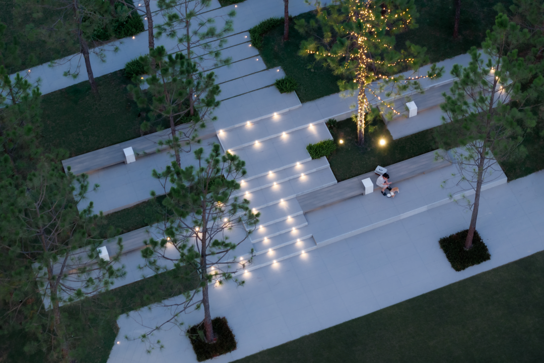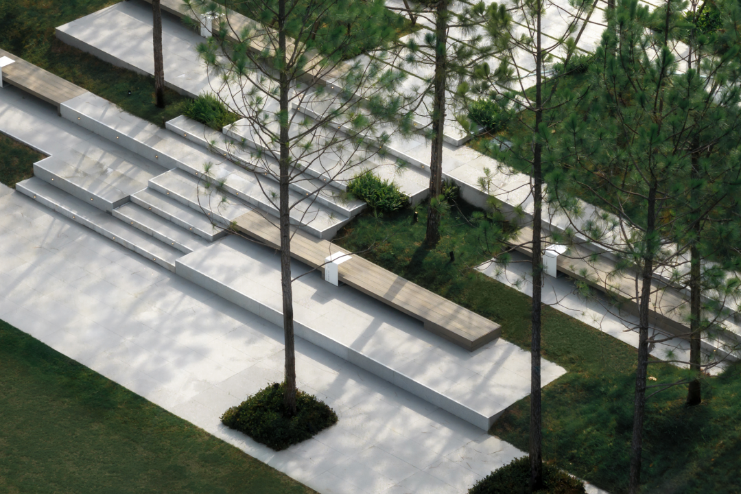 口袋公园作为城市中的“社交原子”,是一个兼具多样使用功能、复合用途以及激活周边社区发展的小尺度开放空间。在该项目中,我们尊重场地原始高差特点,延续大生态基底,植入当代审美的景观构筑作为功能空间与引流体,它是城市共享口袋公园,也是社区与城市内外互通的枢纽。