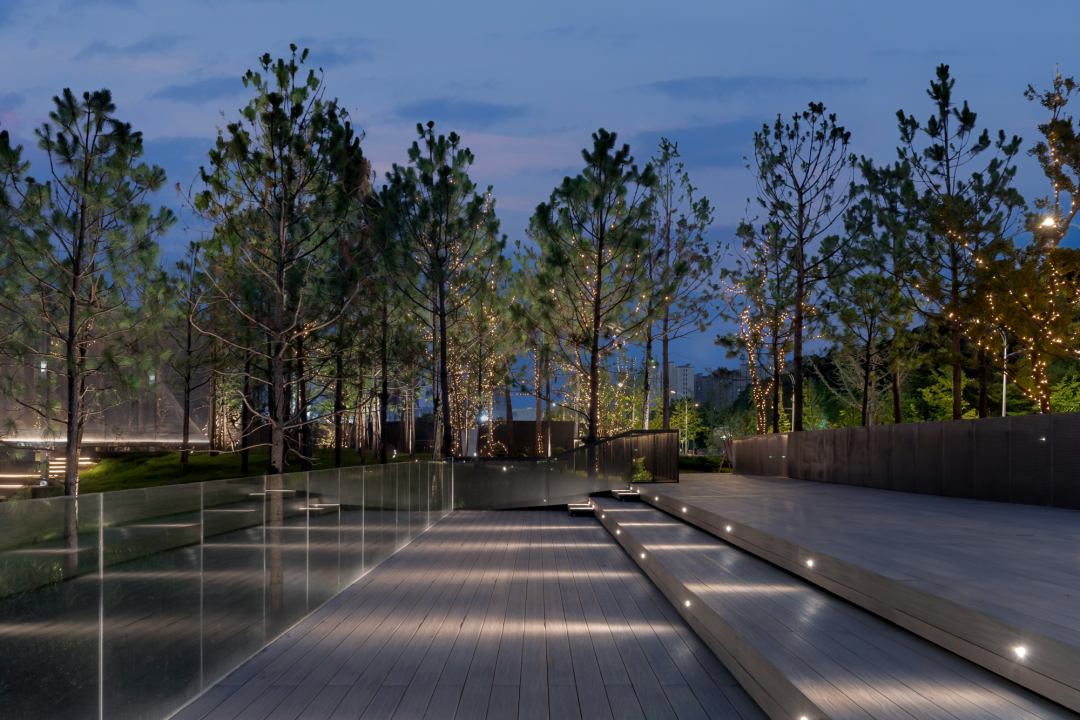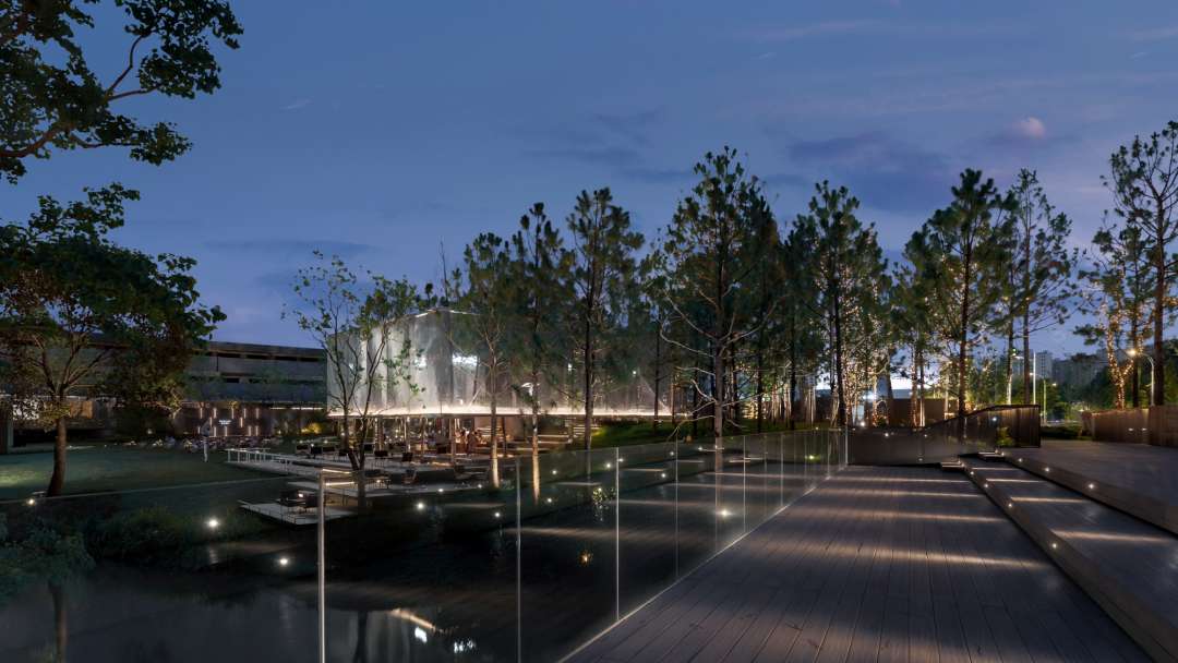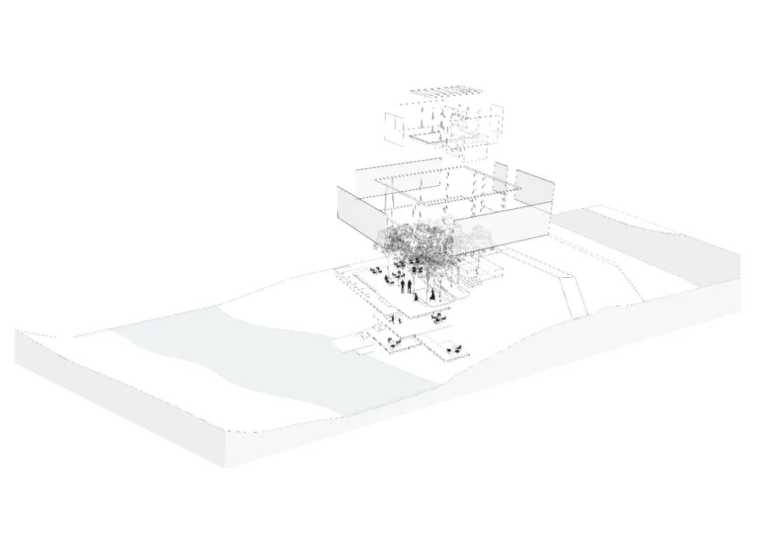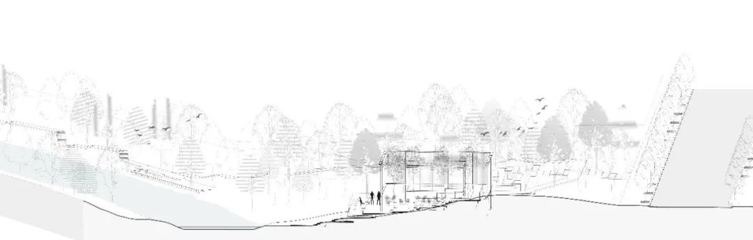 在核心场域西侧公园入口处,还存在着市政设施管道横置在河道之上,无法迁移。我们在其之上搭建木质平台,来规避隐藏这一视线不利因素。平台开阔,层叠向下,边缘处由玻璃围栏包裹,不仅构成了一处自然观河观景的平台,也可作为社群活动场所的补充。