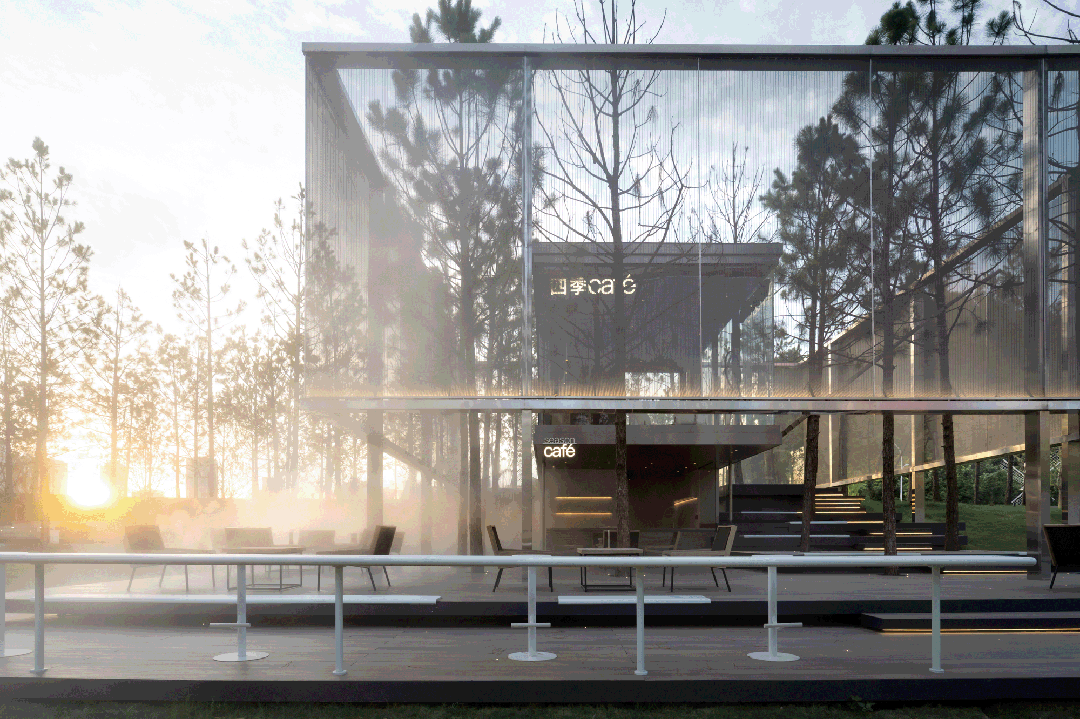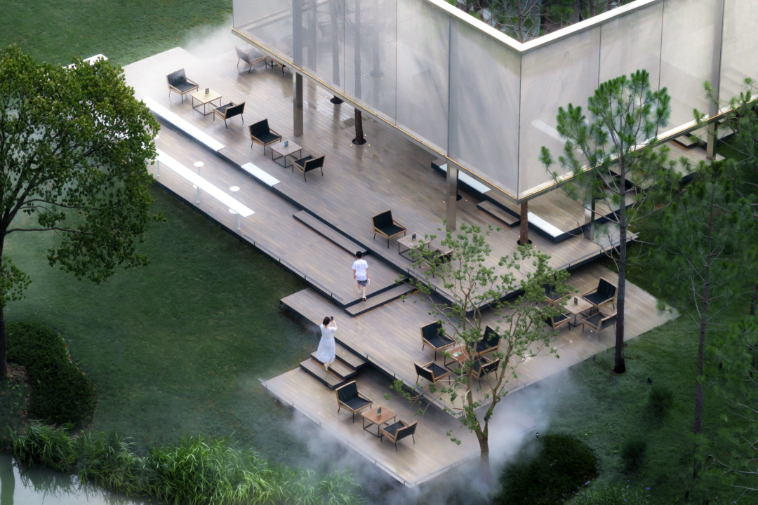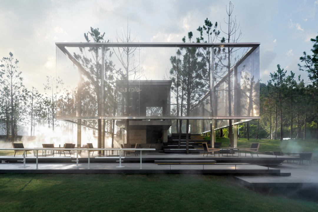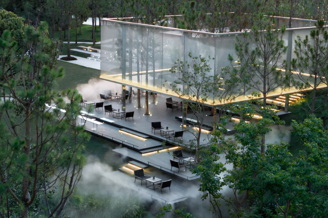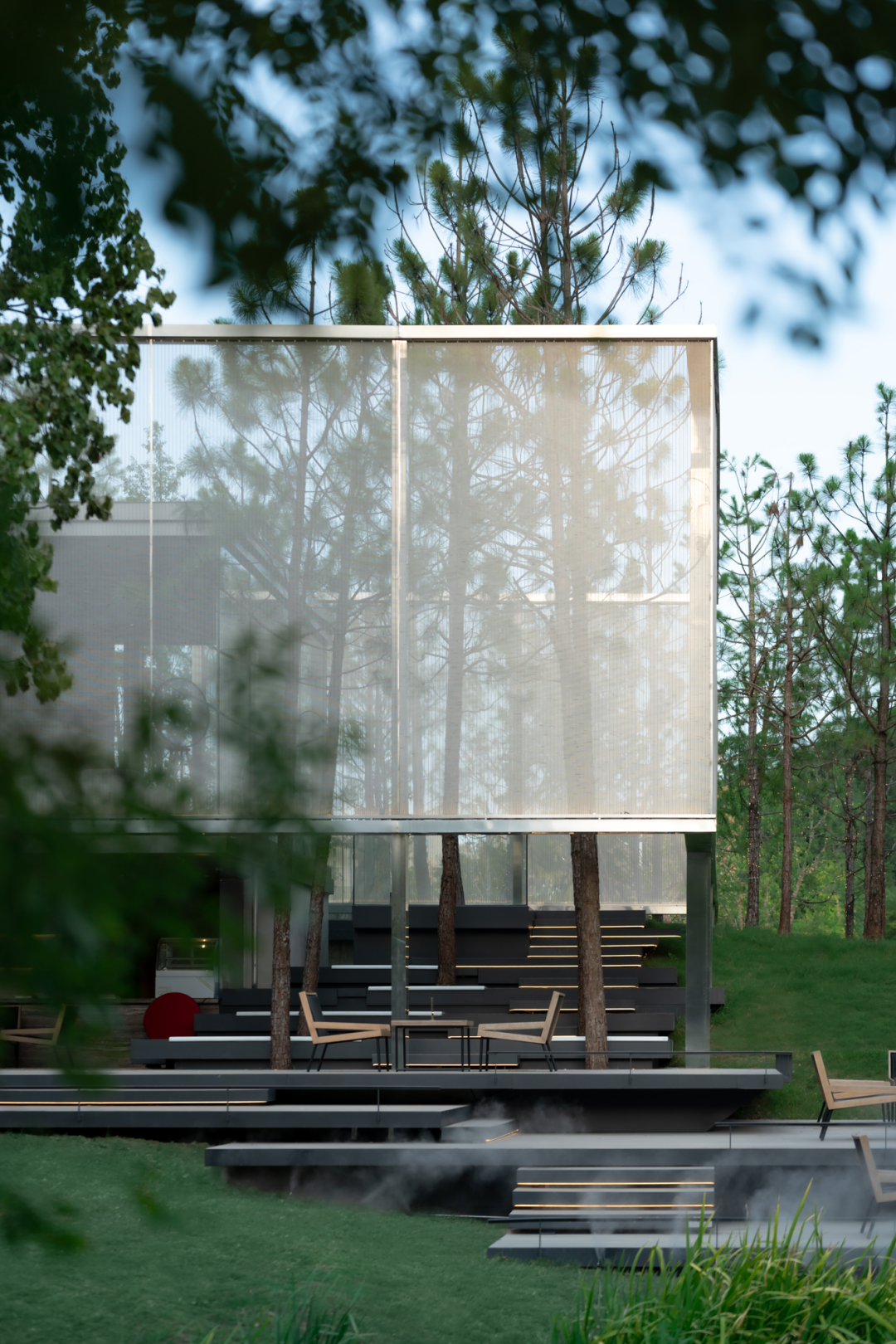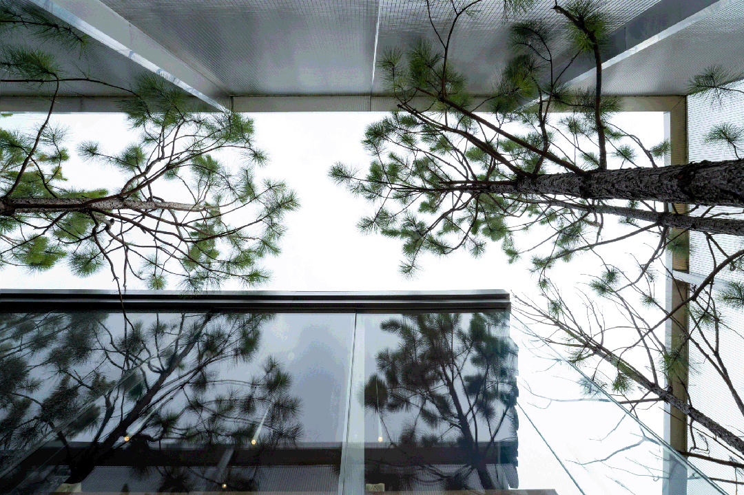 构筑物两层空间实现了对光与环境的过滤,也创造出多一个层级的活动空间,增加了过渡空间。从内向外,玻璃盒子内部透过半透明网格可360度全视野带动感官体验,晨间的白雾在林间弥漫,阳光透过晃动的树影从网格上穿透,风拂过松林间细细簌簌,令人全然沉浸。从外向内,构筑物被隐藏在森林中,部分边界冒出头,从不同角度看可获得不同的被自然切割的景观画面。