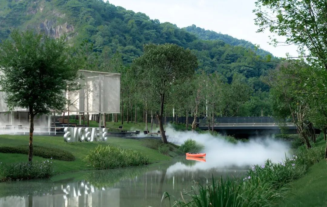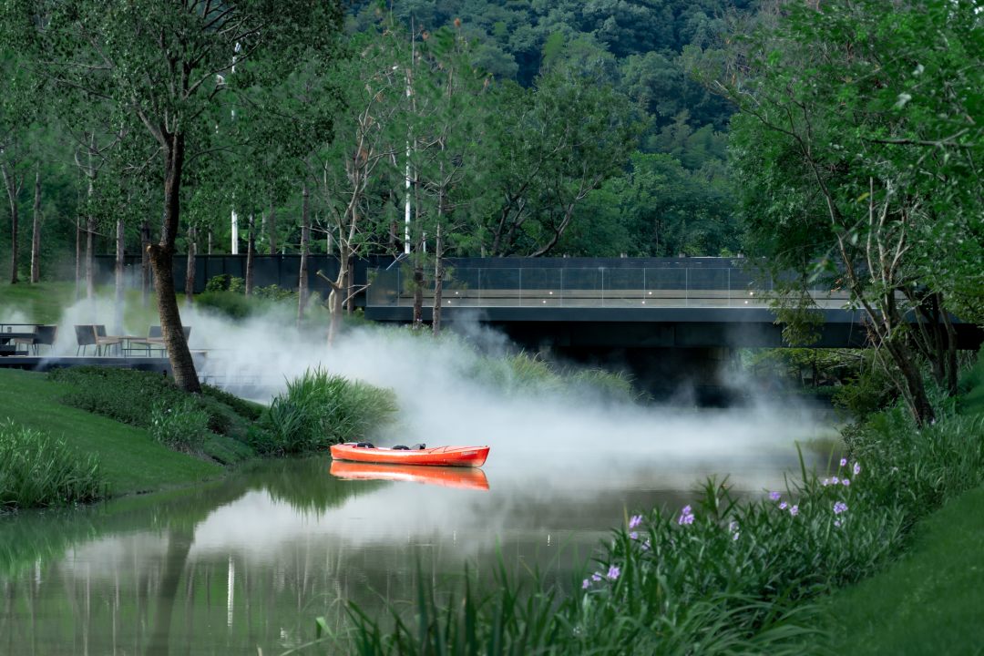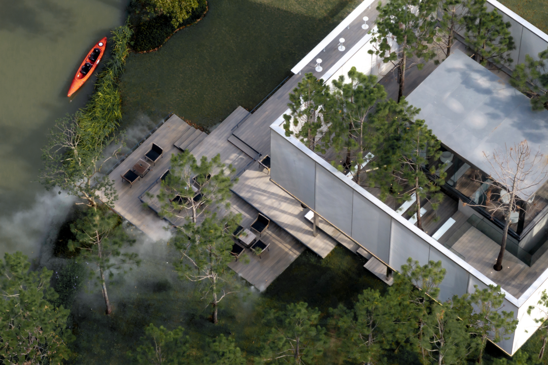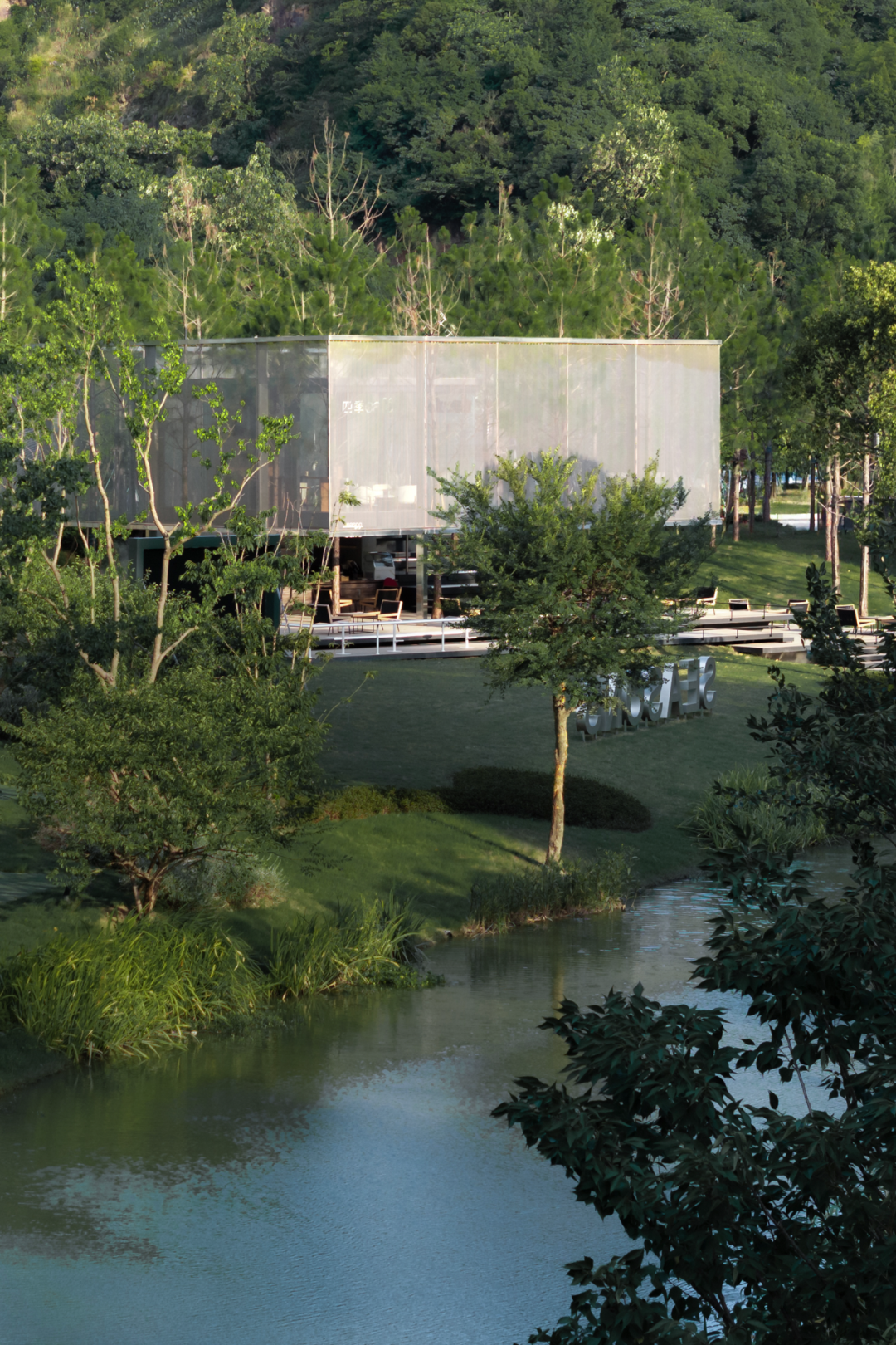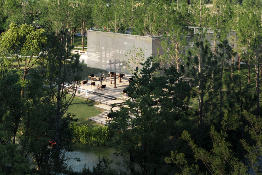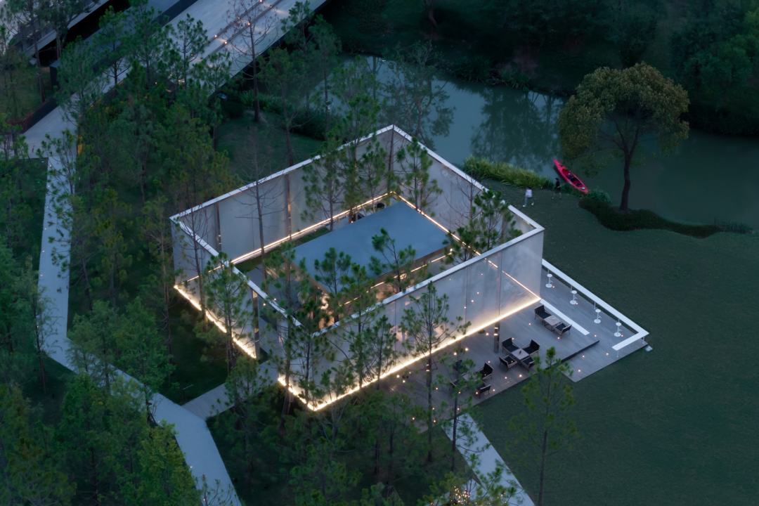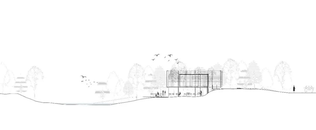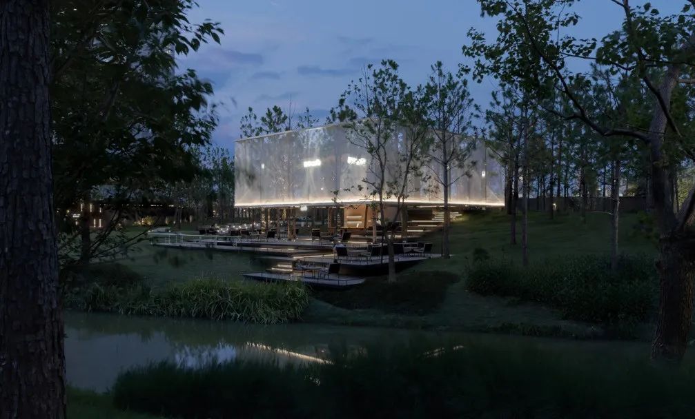 我们利用一片纯林作为景观基底,将周边的自然生态延续到场地中。湿地松是纯林主乔木,四季常绿,树干通直挺拔,叶荫浓郁,苍劲而速生。松林不规则分布其中,犹如生长在河岸边的野生丛林。林下的间隙是折线的小径,指引着人们进入其中。在浓郁的森林之上,一座悬浮在半空中的白色半透明构筑物若隐若现,成为整个空间的视觉焦点。