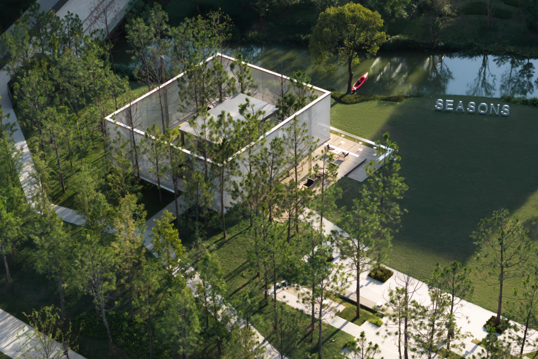 滨河四季的展示区包括一片公共用地和示范花园两部分。公共绿地属于代建,位于十字交叉路口,背靠滨河四季住宅区,西侧是台州南官河支流下保径,河道将住宅组团一分为二。南侧与台州中央山公园一路之隔,周边还有儿童公园、路桥公园等,小小地块被包裹在森林绿意中。