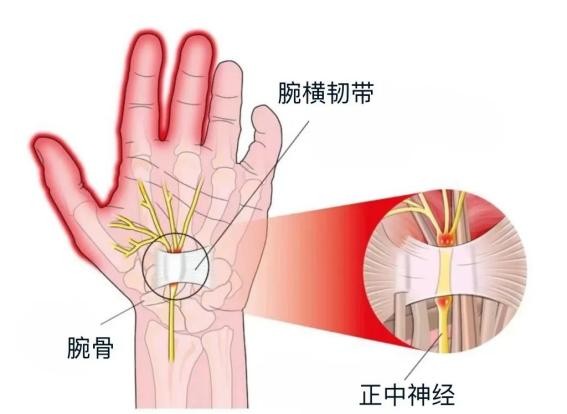 腕管在手掌腕横韧带下方,里面包含了九根肌腱和一根神经,这根神经就是正中神经。