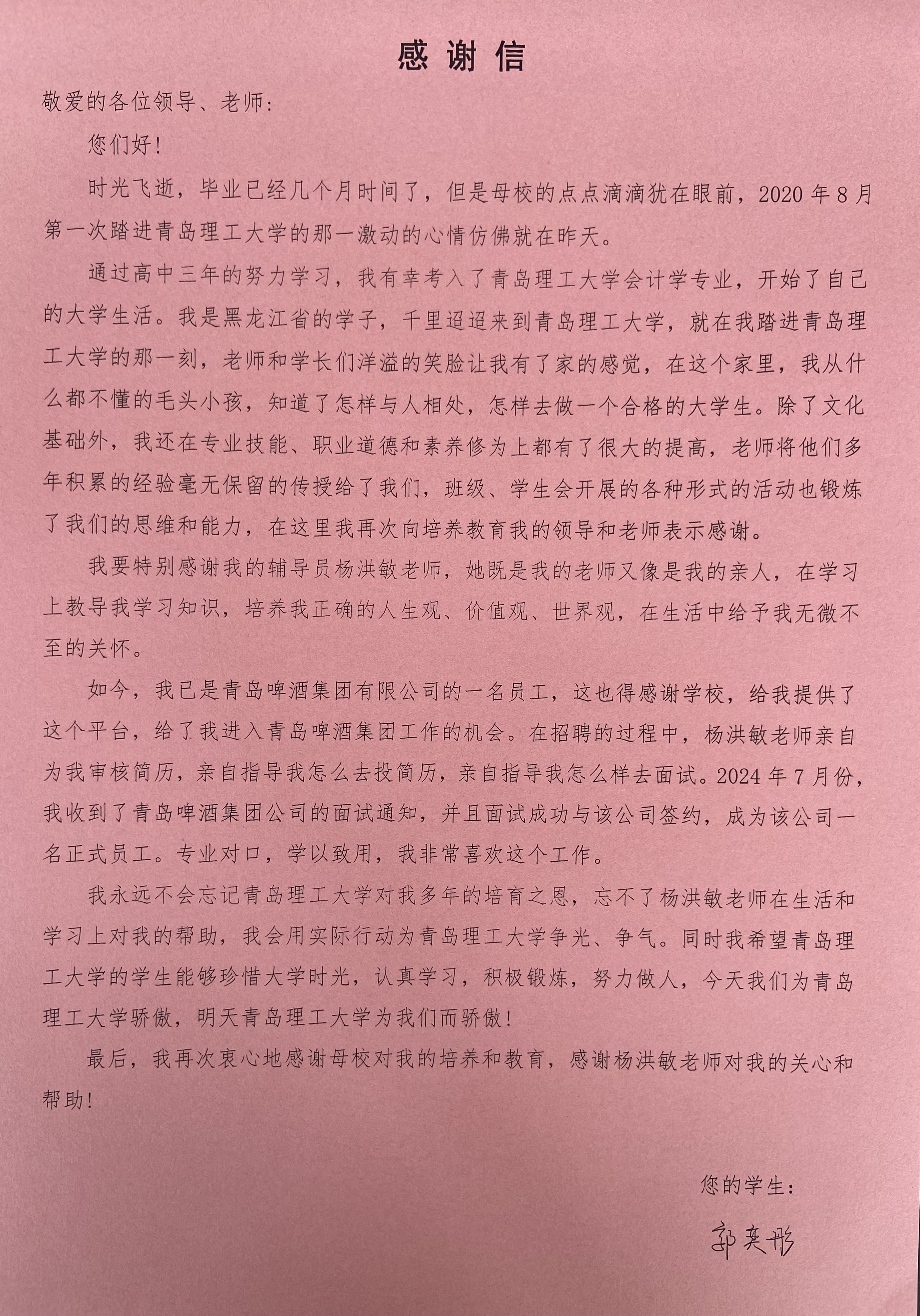 “老师,我面试通过了!”临近毕业前,郭奕彤收到了青岛啤酒股份有限公司的入职通知。“在招聘的过程中,杨洪敏老师亲自为我审核简历,亲自指导我怎么去投递简历,亲自指导我怎么样去面试。”在写给杨洪敏的感谢信中,字里行间都是满满的谢意和浓浓的师生情谊。