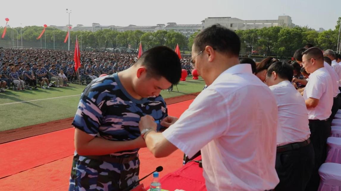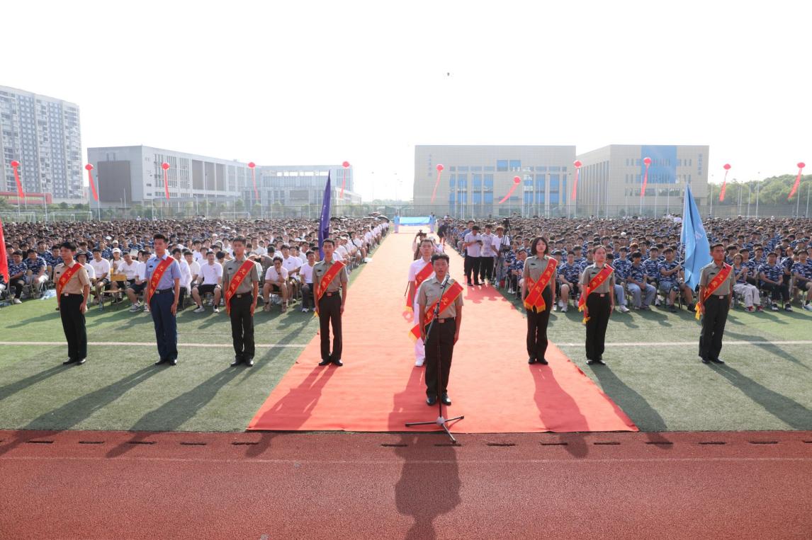 入学仪式上,校领导为新生代表佩戴校徽。2024级新生及退伍复学学生共迎校旗并进行入学宣誓。