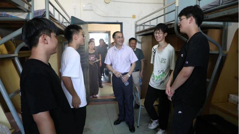 在学生宿舍,校领导与刚报到的新生及家长进行亲切交谈,嘱咐大家要注意休息、严防中暑。“今年的迎新活动比以往准备更充分、安排更合理、引导更用心,明显感觉到新生和家长们脸上的笑容更多了。”汪胜前肯定了今年的迎新工作成果。“希望你们能做好新学期的规划,期待你们学有所成!”刘祖文来到所联系学院对新生说。