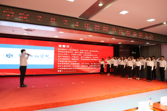 会上举行了新教师入职仪式,退休教师代表为新入职教师代表佩戴校徽,新入职教师进行了宣誓。