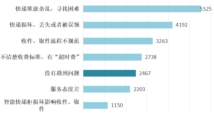 5525名调查对象表示“快递堆放杂乱,寻找困难”,约占总样本数据一半,即49%;