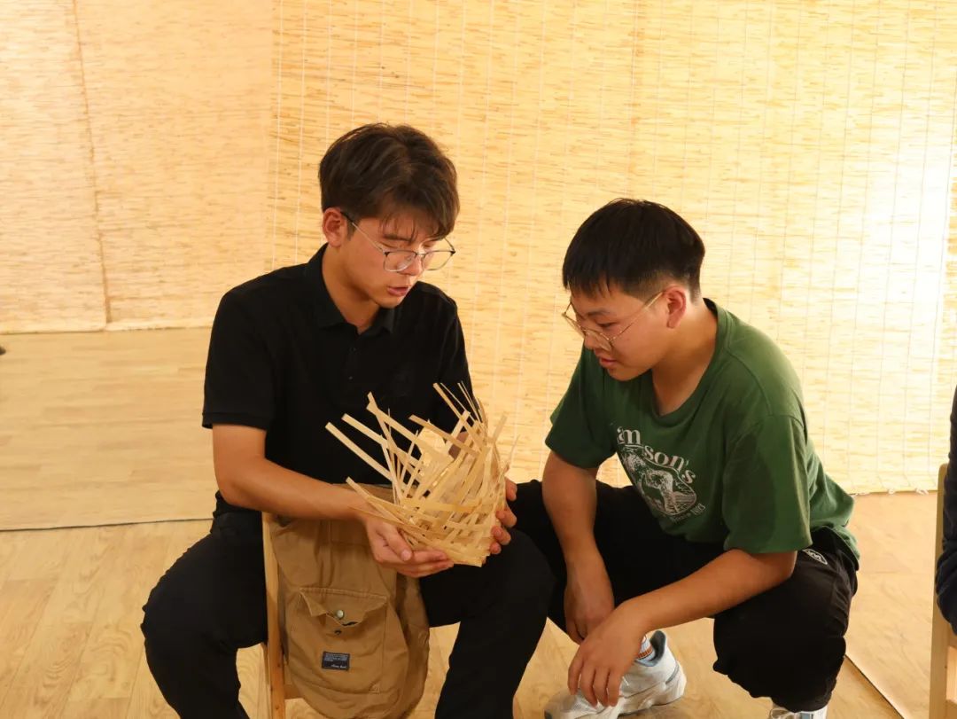 在“手工艺品制作”环节,学生学习了手工竹筐编织和扎染的相关理论知识,了解编织材料的种类及特性、扎染的流程与原理,结合指导老师的技巧讲解,亲自动手操作,设计并完成个人作品。