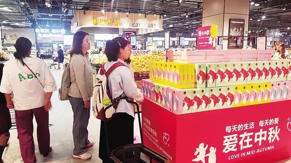 顾客在超市挑选月饼。