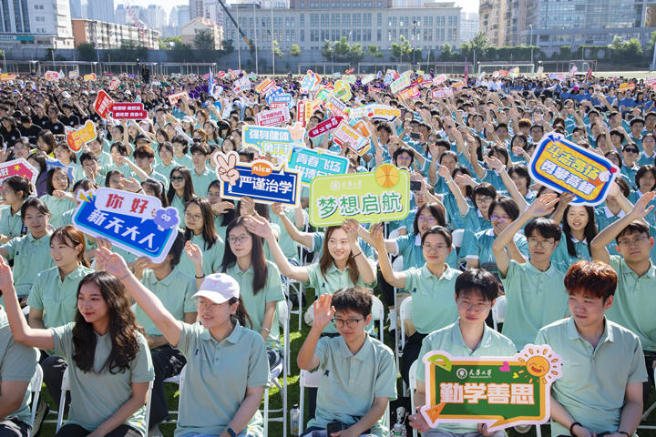 戴上“北洋盾”的校徽,高唱起“花堤蔼蔼、北运滔滔……”的校歌,天津大学13000余名2024级新生在这一天开启了他们为热爱奋斗的新征程,踌躇满志、意气风发、青春激扬。9月12日上午,天津大学2024年开学典礼在双校区同步举行。