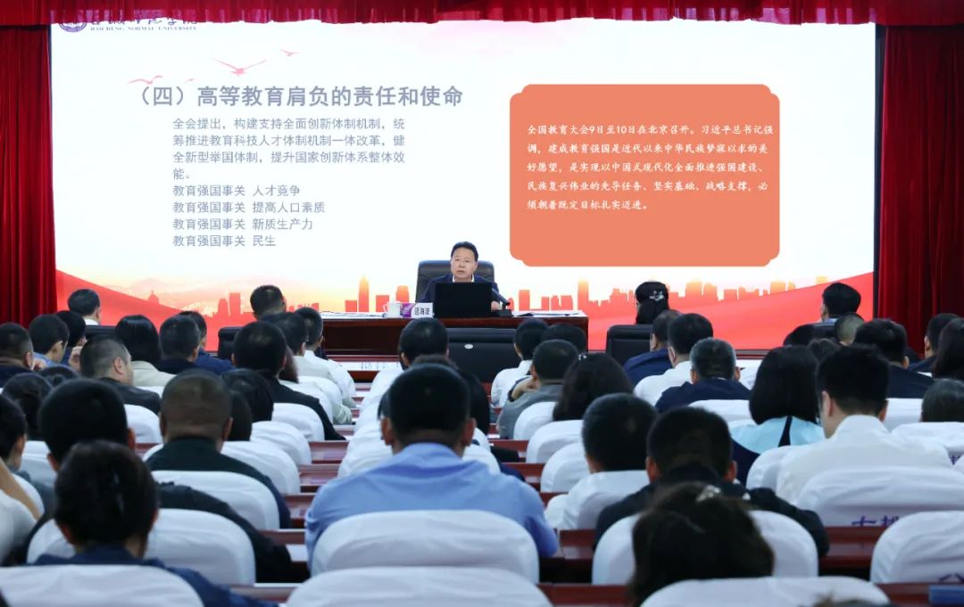 迟海波以《深学细悟促实干 勇担重任开新局 在全面深化改革新征程中贡献白师力量》为题,重点解读《中共中央关于进一步全面深化改革、推进中国式现代化的决定》中在教育、科技、人才三位一体方面的新部署、新要求,深入剖析了高等教育在全面深化改革推进中国式现代化进程中的责任和使命,激励引导广大干部教师和青年学子为中国式现代化建设挺膺担当。