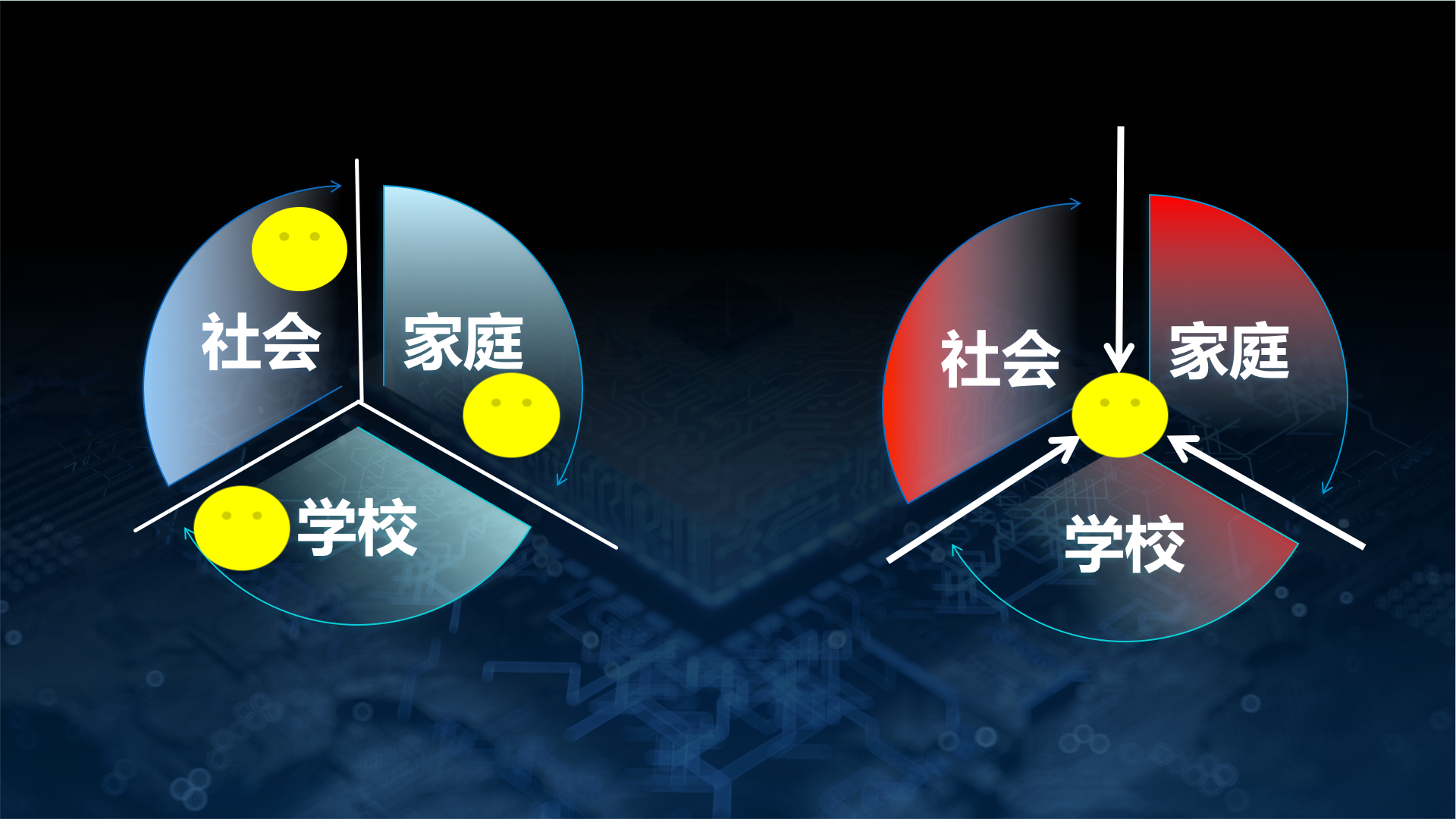 我们今天的教育分为三大块,家庭教育、社会教育、学校教育,在我的心目中,家庭教育、学校教育、社会教育是干什么,是分别给孩子安全的、自由的空间。但是我们今天受到的教育,它在干什么呢,它就把孩子堵在一个区、一个地方,家庭、社会、学校在挤压孩子的空间,孩子的空间不是越来越大,而是越来越小。