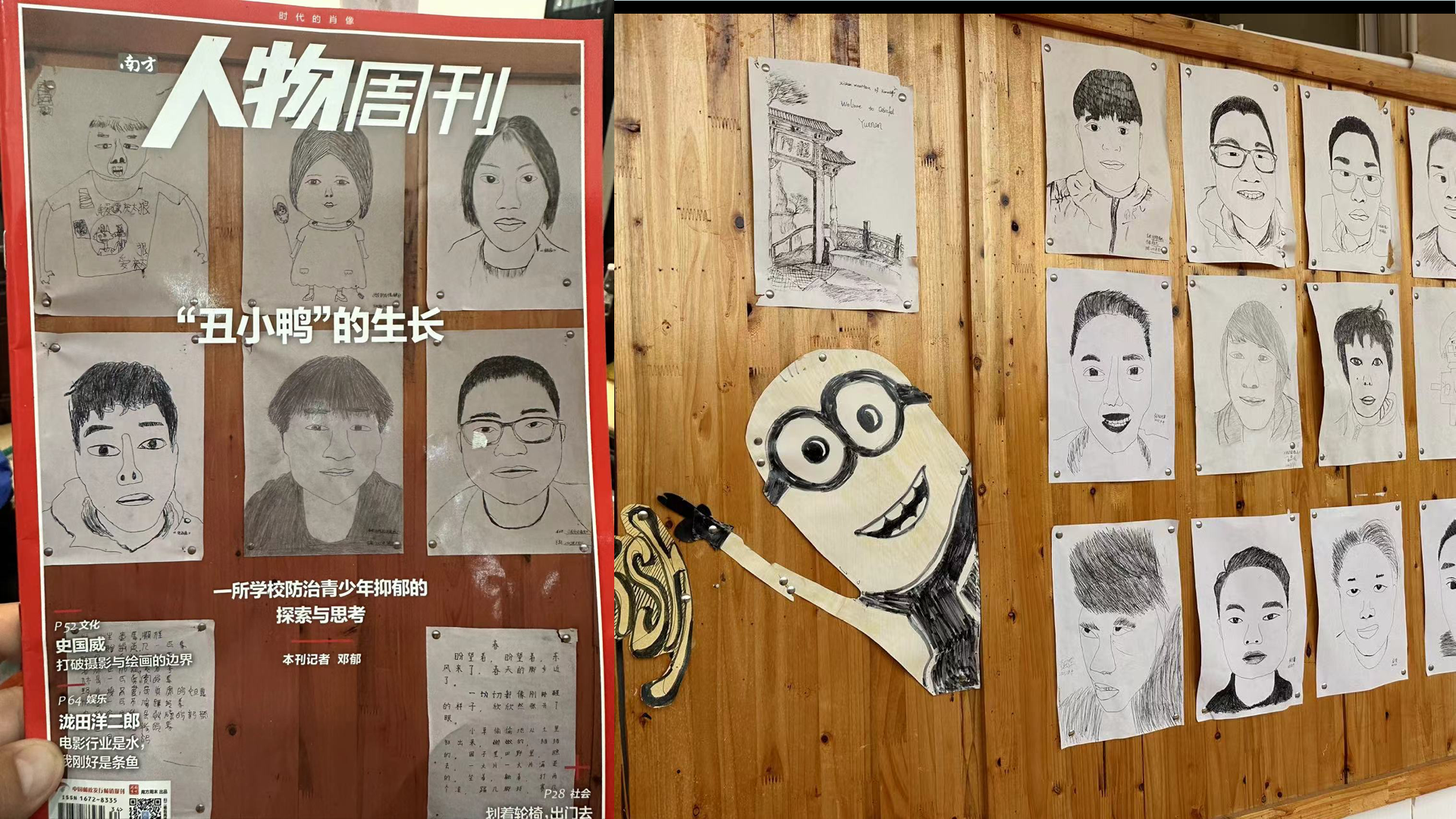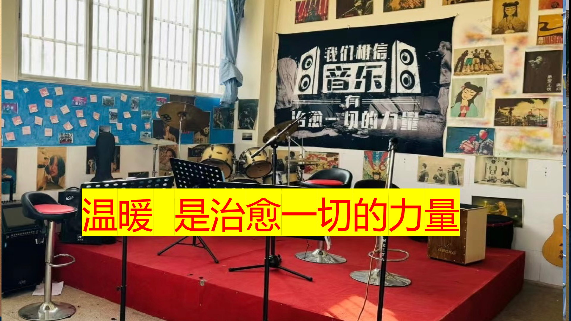 孩子们自己画自己,也自己画老师,他们会把他们画的图贴起来。而我们学校的男孩,绝大部分男孩,多数女孩都会弹吉他,为什么弹吉他?大家看有一句话贴在墙上的,这个吉他室是他们自己布置的,我们相信音乐有治愈一切的力量,治愈自己。