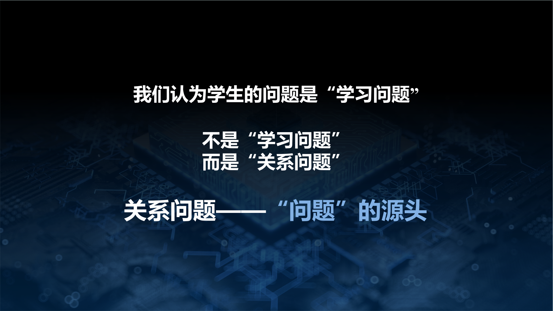 我这里说的什么意思,各位,如果一个孩子学习出问题了,你在学习上找原因,你从学习上下功夫是没有用的,你从关系上找原因,从关系上下功夫,找到关系问题,把关系问题修复就解决了。我讲的问题学生,其实他们只有一个问题,他们遇到关系问题,他们没有能力修复关系问题,并且他们遇到了一个不会修复关系的人,这样问题就越来越大了,所以关系问题是一切问题的源头。