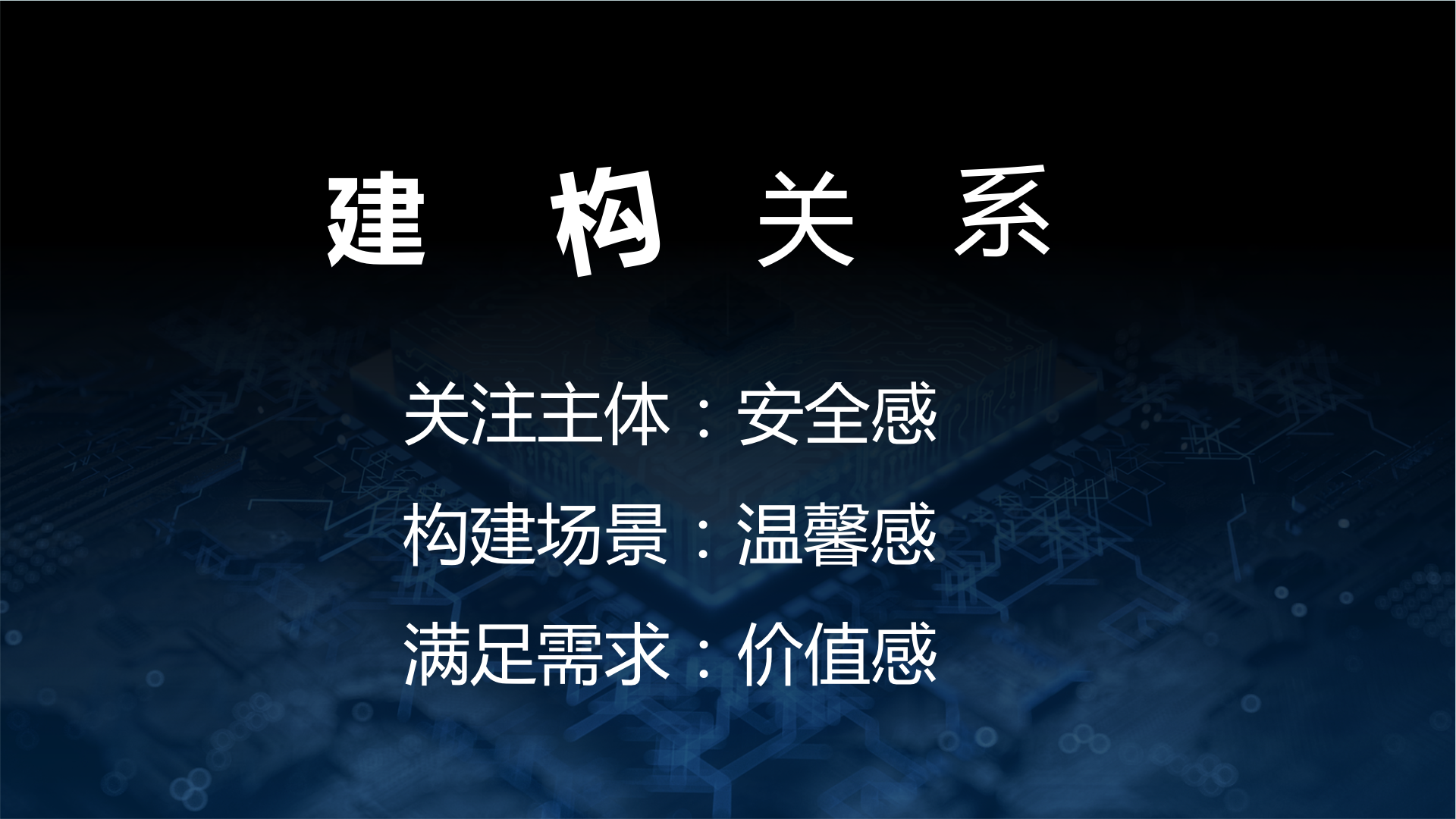 我们怎么做的呢?九个字:安全感、温馨感、价值感,其实人所追求的都是安全感、 温馨感、价值感,关注了主体的安全感,构建了场景的温馨感,满足了需求的价值感,关系就好了。