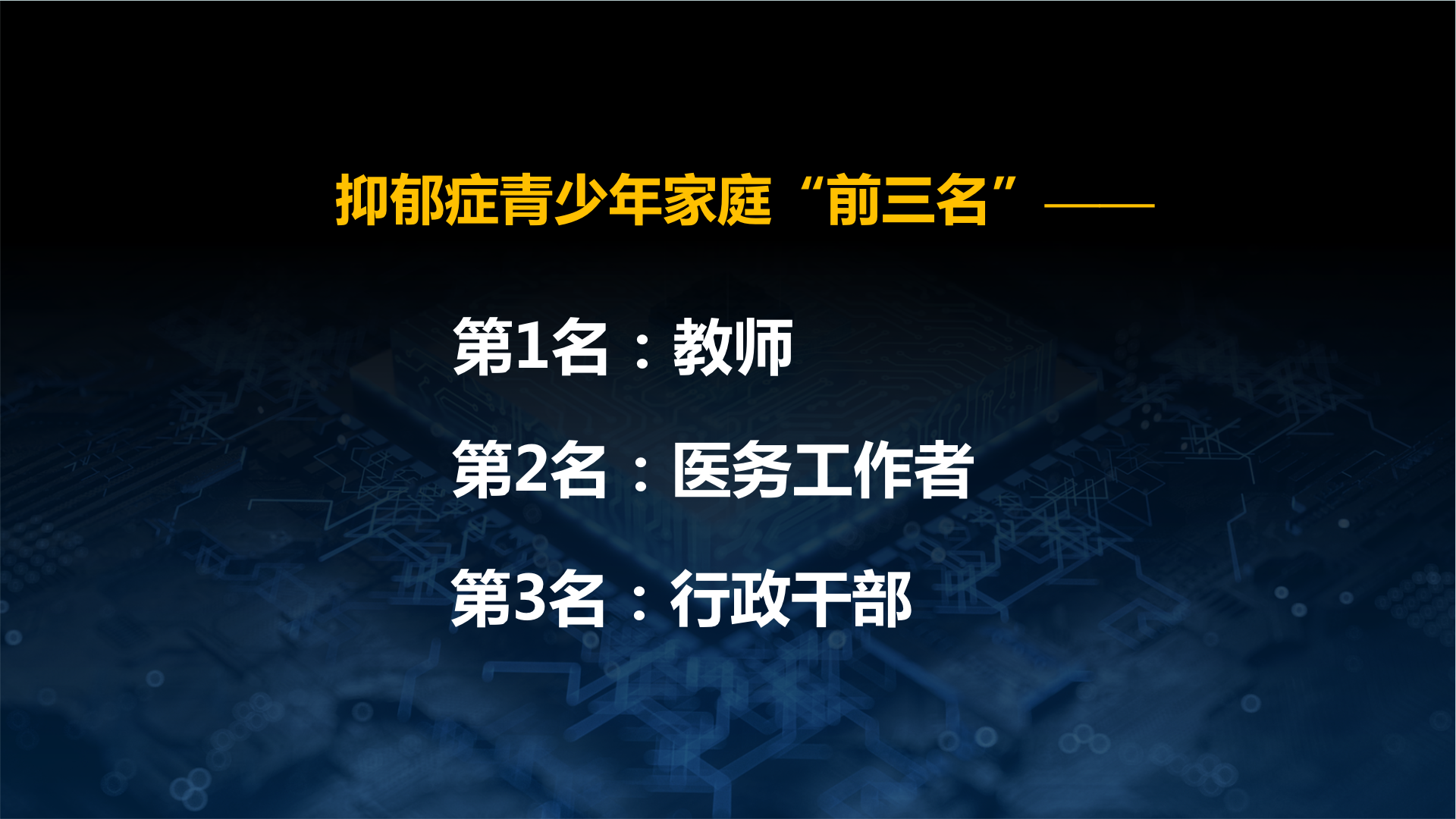 抑郁症青少年家庭的前三名,我们看看,第一名是教师家庭,第二名是医护家庭,第三名是行政干部家庭。说起来好像很滑稽,为什么教师家庭自己的孩子会变成抑郁症?