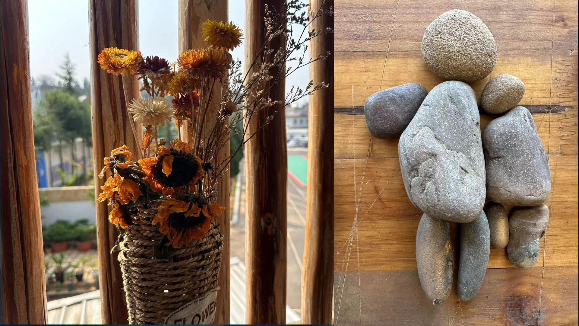 这是他们从山上采来的野花、野草搞成插花,山上捡的石头,你看做成这种非常可爱的、非常有感觉的图案。